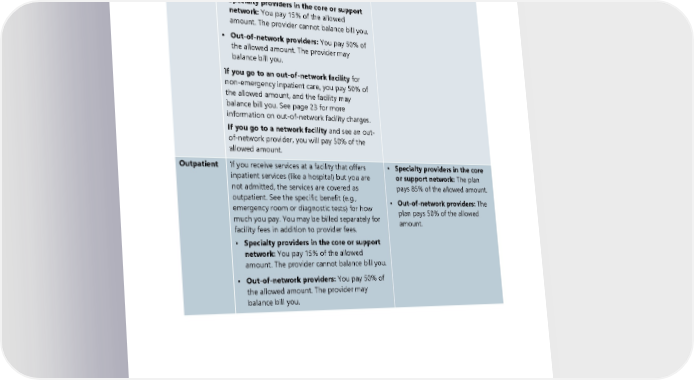 Type of How much you pay for covered services How much the plan pays for service covered services • Fees for professional services, such as, but not limited to, provider consultations or lab tests. How much you pay for professional services depends on the provider’s network status: • Specialty providers in the core or support network: You pay 15% of the allowed amount. The provider cannot balance bill you. • Out-of-network providers: You pay 50% of the allowed amount. The provider may balance bill you. If you go to an out-of-network facility for non-emergency inpatient care, you pay 50% of the allowed amount, and the facility may balance bill you. See page 23 for more information on out-of-network facility charges. If you go to a network facility and see an out- of-network provider, you will pay 50% of the allowed amount. Outpatient If you receive services at a facility that offers • Specialty providers in the core inpatient services (like a hospital) but you are or support network: The plan not admitted, the services are covered as pays 85% of the allowed amount. outpatient. See the specific benefit (e.g., • Out-of-network providers: The emergency room or diagnostic tests) for how plan pays 50% of the allowed much you pay. You may be billed separately for amount. facility fees in addition to provider fees. • Specialty providers in the core or support network: You pay 15% of the allowed amount. The provider cannot balance bill you. • Out-of-network providers: You pay 50% of the allowed amount. The provider may balance bill you. 36 2024 UMP Plus–UW Medicine ACN (PEBB) Certificate of Coverage