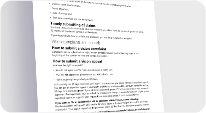 How to submit a vision claim for reimbursement When you visit a VSP Choice network provider, the doctor will submit the claim directly to VSP for payment. If you are a member and are age 19 or older and you see an out-of-network provider, you pay 100 percent of the billed charges. You can submit the claim online or by mail. See the Directory pages at the beginning of this booklet for links and contact information. When you submit a claim, attach an itemized receipt that includes the following information: • Doctor’s name or office name; • Name of patient; • Date of service; and • Each service received and the amount paid. Timely submitting of claims You have 12 months from the date of service to submit your claim. If you do not submit your claim within 12 months of the date of service, it will be denied. If you disagree with how your claim was processed, you may file a complaint or an appeal. Vision complaints and appeals How to submit a vision complaint Complaints can be submitted through a written or verbal request. See the Directory pages at the beginning of this booklet for links and contact information. How to submit a vision appeal You have the right to appeal if: • You do not agree with VSP's decision about your health care. • VSP will not approve or give you care you feel it should cover. • VSP is stopping care you feel you still need. VSP normally has 30 days to process your appeal. In some cases, you have a right to an expedited appeal. You can get an expedited appeal if your health or ability to function could be seriously harmed by waiting 30 days for a standard appeal. If you ask for an expedited appeal, VSP will decide whether your request is approved. If not approved, your appeal will be processed in 30 days. If any doctor asks VSP to give you an expedited appeal, or supports your request for an expedited appeal, it must be given to you. If you want to file an appeal which will be processed within 30 days, do the following: File the request in writing with VSP. See the Directory pages at the beginning of this booklet for contact information. Your appeal request will be processed within 30 days from the date your request is received. If you want to file an expedited appeal, which will be processed within 24 hours, do the following: • File an oral or written request for an expedited appeal. Specifically state that "I am requesting an expedited appeal," or "I believe that my health could be seriously harmed by waiting 30 days for a normal appeal." • To file a request orally, contact VSP Member Services. VSP will document the oral request in writing. See the Directory pages at the beginning of this booklet for contact information. 84 2024 UMP Plus–UW Medicine ACN (PEBB) Certificate of Coverage