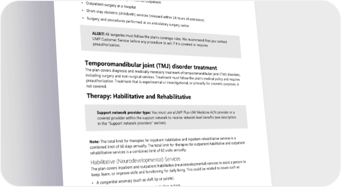 Your provider must notify the plan when you are admitted for inpatient treatment and when you receive certain services. Some outpatient procedures require preauthorization. Find the list of services that require preauthorization on the UMP Policies that affect your care webpage. Contact UMP Customer Service if you have questions. See Directory for link and contact information. If services are inpatient (see definition of “Inpatient stay”), you will also pay an inpatient copay for facility charges at a network facility. The plan covers the following services as outpatient: • Outpatient surgery at a hospital • Short-stay obstetric (childbirth) services (released within 24 hours of admission) • Surgery and procedures performed at an ambulatory surgery center ALERT! All surgeries must follow the plan’s coverage rules. We recommend that you contact UMP Customer Service before any procedure to ask if it is covered or requires preauthorization. Temporomandibular joint (TMJ) disorder treatment The plan covers diagnosis and medically necessary treatment of temporomandibular joint (TMJ) disorders, including surgery and non-surgical services. Treatment must follow the plan’s medical policy and requires preauthorization. Treatment that is experimental or investigational, or primarily for cosmetic purposes, is not covered. Therapy: Habilitative and Rehabilitative Support network provider type: You must use a UMP Plus–UW Medicine ACN provider or a covered provider within the support network to receive network level benefits (see description in the “Support network providers” section). Note: The total limit for therapies for inpatient habilitative and inpatient rehabilitative services is a combined limit of 60 days annually. The total limit for therapies for outpatient habilitative and outpatient rehabilitative services is a combined limit of 60 visits annually. Habilitative (Neurodevelopmental) Services The plan covers inpatient and outpatient habilitative (neurodevelopmental) services to assist a person to keep, learn, or improve skills and functioning for daily living. This could be related to issues such as: • A congenital anomaly (such as cleft lip or palate). • Conditions of developmental delay, including autism. For the purposes of this benefit, developmental delay means a significant lag in achieving skills such as: • Cognitive (thinking). • Language (speech, reading, writing). • Motor (crawling, walking, feeding oneself). • Social (getting along with others). 72 2024 UMP Plus–UW Medicine ACN (PEBB) Certificate of Coverage