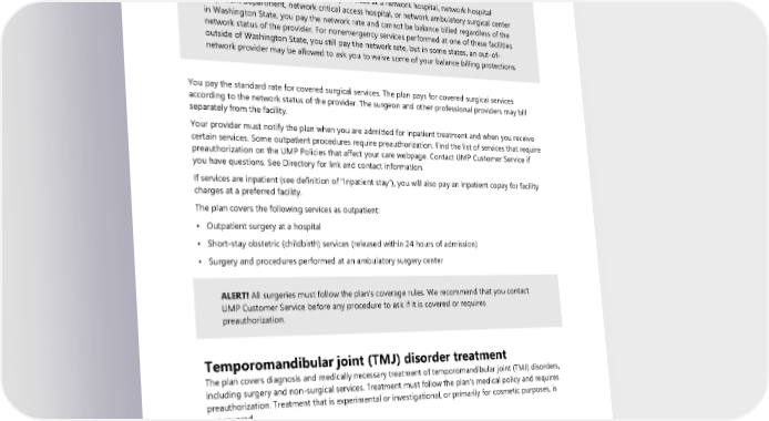Substance use disorder See the “Behavioral health” benefit. Surgery Note: When you receive nonemergency services at a network hospital, network hospital outpatient department, network critical access hospital, or network ambulatory surgical center in Washington State, you pay the network rate and cannot be balance billed regardless of the network status of the provider. For nonemergency services performed at one of these facilities outside of Washington State, you still pay the network rate, but in some states, an out-of- network provider may be allowed to ask you to waive some of your balance billing protections. You pay the standard rate for covered surgical services. The plan pays for covered surgical services according to the network status of the provider. The surgeon and other professional providers may bill separately from the facility. Your provider must notify the plan when you are admitted for inpatient treatment and when you receive certain services. Some outpatient procedures require preauthorization. Find the list of services that require preauthorization on the UMP Policies that affect your care webpage. Contact UMP Customer Service if you have questions. See Directory for link and contact information. If services are inpatient (see definition of “Inpatient stay”), you will also pay an inpatient copay for facility charges at a preferred facility. The plan covers the following services as outpatient: • Outpatient surgery at a hospital • Short-stay obstetric (childbirth) services (released within 24 hours of admission) • Surgery and procedures performed at an ambulatory surgery center ALERT! All surgeries must follow the plan’s coverage rules. We recommend that you contact UMP Customer Service before any procedure to ask if it is covered or requires preauthorization. Temporomandibular joint (TMJ) disorder treatment The plan covers diagnosis and medically necessary treatment of temporomandibular joint (TMJ) disorders, including surgery and non-surgical services. Treatment must follow the plan’s medical policy and requires preauthorization. Treatment that is experimental or investigational, or primarily for cosmetic purposes, is not covered. Therapy: Habilitative and Rehabilitative Note: The total limit for therapies for inpatient habilitative and inpatient rehabilitative services is a combined limit of 60 days annually. The total limit for therapies for outpatient habilitative and outpatient rehabilitative services is a combined limit of 60 visits annually. 72 2024 UMP Select (PEBB) Certificate of Coverage