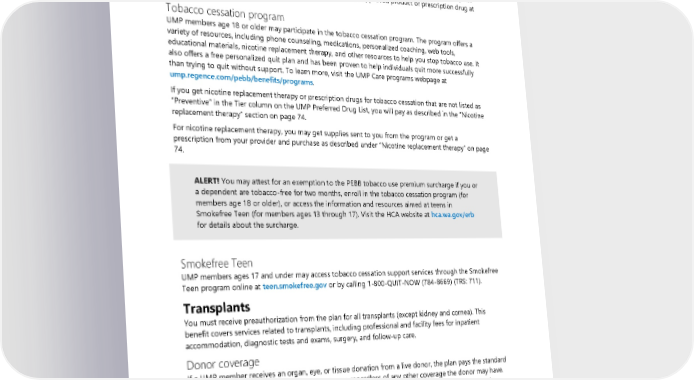 Phone or online counseling is covered only through the Tobacco cessation program described below. UMP members ages 17 and under may use the Smokefree Teen program as explained below. How to request an exception To request coverage of a prescription drug or nicotine replacement therapy not usually covered under this benefit, see “Requesting an exception for noncovered prescription drugs” on page 87 for how to request an exception. If your exception is approved, you will receive the approved product or prescription drug at no cost. Tobacco cessation program UMP members age 18 or older may participate in the tobacco cessation program. The program offers a variety of resources, including phone counseling, medications, personalized coaching, web tools, educational materials, nicotine replacement therapy, and other resources to help you stop tobacco use. It also offers a free personalized quit plan and has been proven to help individuals quit more successfully than trying to quit without support. To learn more, visit the UMP Care programs webpage at ump.regence.com/pebb/benefits/programs. If you get nicotine replacement therapy or prescription drugs for tobacco cessation that are not listed as “Preventive” in the Tier column on the UMP Preferred Drug List, you will pay as described in the “Nicotine replacement therapy” section on page 74. For nicotine replacement therapy, you may get supplies sent to you from the program or get a prescription from your provider and purchase as described under “Nicotine replacement therapy” on page 74. ALERT! You may attest for an exemption to the PEBB tobacco use premium surcharge if you or a dependent are tobacco-free for two months, enroll in the tobacco cessation program (for members age 18 or older), or access the information and resources aimed at teens in Smokefree Teen (for members ages 13 through 17). Visit the HCA website at hca.wa.gov/erb for details about the surcharge. Smokefree Teen UMP members ages 17 and under may access tobacco cessation support services through the Smokefree Teen program online at teen.smokefree.gov or by calling 1-800-QUIT-NOW (784-8669) (TRS: 711). Transplants You must receive preauthorization from the plan for all transplants (except kidney and cornea). This benefit covers services related to transplants, including professional and facility fees for inpatient accommodation, diagnostic tests and exams, surgery, and follow-up care. Donor coverage If a UMP member receives an organ, eye, or tissue donation from a live donor, the plan pays the standard rate for the donor’s covered expenses as primary, regardless of any other coverage the donor may have. Covered donor expenses include costs to remove the donor’s organ and treat complications directly resulting from the donor’s surgery. Urgent care See the “Emergency room” benefit for care during a medical emergency. 2024 UMP Select (PEBB) Certificate of Coverage 75