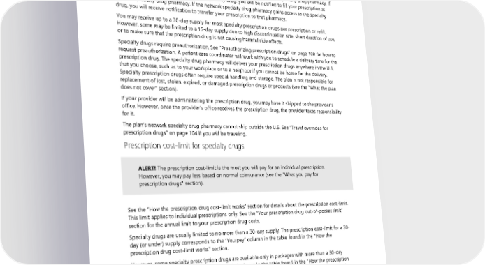 Specialty drugs are high-cost injectable, infused, oral, or inhaled prescription drugs or products that require special handling and storage and are subject to additional rules. You may find out if a drug is a specialty drug by checking the UMP Preferred Drug List on the UMP Prescription drug coverage webpage, or by contacting WSRxS Customer Service (see Directory for link and contact information). Specialty drugs are covered under the cost-share tier listed on the UMP Preferred Drug List. Specialty drugs are covered only when purchased through the plan’s network specialty drug pharmacy. If that pharmacy does not have access to a specialty drug, you will be notified to fill your prescription at another specialty drug pharmacy. If the network specialty drug pharmacy gains access to the specialty drug, you will receive notification to transfer your prescription to that pharmacy. You may receive up to a 30-day supply for most specialty prescription drugs per prescription or refill. However, some may be limited to a 15-day supply due to high discontinuation rate, short duration of use, or to make sure that the prescription drug is not causing harmful side effects. Specialty drugs require preauthorization. See “Preauthorizing prescription drugs” on page 100 for how to request preauthorization. A patient care coordinator will work with you to schedule a delivery time for the prescription drug. The specialty drug pharmacy will deliver your prescription drugs anywhere in the U.S. that you choose, such as to your workplace or to a neighbor if you cannot be home for the delivery. Specialty prescription drugs often require special handling and storage. The plan is not responsible for replacement of lost, stolen, expired, or damaged prescription drugs or products (see the “What the plan does not cover” section). If your provider will be administering the prescription drug, you may have it shipped to the provider’s office. However, once the provider’s office receives the prescription drug, the provider takes responsibility for it. The plan’s network specialty drug pharmacy cannot ship outside the U.S. See “Travel overrides for prescription drugs” on page 104 if you will be traveling. Prescription cost-limit for specialty drugs ALERT! The prescription cost-limit is the most you will pay for an individual prescription. However, you may pay less based on normal coinsurance (see the "What you pay for prescription drugs" section). See the “How the prescription drug cost-limit works” section for details about the prescription cost-limit. This limit applies to individual prescriptions only. See the “Your prescription drug out-of-pocket limit” section for the annual limit to your prescription drug costs. Specialty drugs are usually limited to no more than a 30-day supply. The prescription cost-limit for a 30- day (or under) supply corresponds to the “You pay” column in the table found in the "How the prescription drug cost-limit works" section. However, some specialty prescription drugs are available only in packages with more than a 30-day supply. In such cases, the prescription cost-limit shown in the table found in the "How the prescription drug cost-limit works" section is calculated by multiplying the standard 30-day prescription cost-limit amount as follows: • A 31- to 60-day supply, multiply the standard prescription cost-limit by two. • A 61-day and greater supply, multiply the standard prescription cost-limit by three. 102 2024 UMP Select (PEBB) Certificate of Coverage