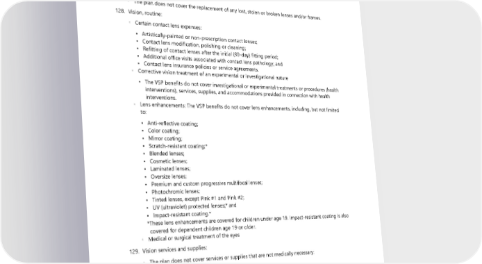 124. Upright magnetic resonance imaging (uMRI), also known as “positional,” “weight-bearing” (partial or full), or “axial loading” 125. Vagal nerve stimulation (VNS) for treatment-resistant depression 126. Vagal nerve stimulation (VNS) for the treatment of depression (does not include or apply to support of previously implanted VNS) 127. Vision hardware replacements: ◦ The plan does not cover the replacement of any lost, stolen or broken lenses and/or frames. 128. Vision, routine: ◦ Certain contact lens expenses: • Artistically-painted or non-prescription contact lenses; • Contact lens modification, polishing or cleaning; • Refitting of contact lenses after the initial (90-day) fitting period; • Additional office visits associated with contact lens pathology; and • Contact lens insurance policies or service agreements. ◦ Corrective vision treatment of an experimental or investigational nature • The VSP benefits do not cover investigational or experimental treatments or procedures (health interventions), services, supplies, and accommodations provided in connection with health interventions. ◦ Lens enhancements: The VSP benefits do not cover lens enhancements, including, but not limited to: • Anti-reflective coating; • Color coating; • Mirror coating; • Scratch-resistant coating;* • Blended lenses; • Cosmetic lenses; • Laminated lenses; • Oversize lenses; • Premium and custom progressive multifocal lenses; • Photochromic lenses; • Tinted lenses, except Pink #1 and Pink #2; • UV (ultraviolet) protected lenses;* and • Impact-resistant coating.* *These lens enhancements are covered for children under age 19. Impact-resistant coating is also covered for dependent children age 19 or older. ◦ Medical or surgical treatment of the eyes 129. Vision services and supplies: ◦ The plan does not cover services or supplies that are not medically necessary: • Plano lenses (less than a ± .50 diopter power). • Two pair of glasses instead of bifocals. • Services and/or materials not described as covered under this vision benefit. 130. Vitamin D screening and testing as part of routine screening 131. Weight control, weight loss, and obesity treatment: ◦ Non-surgical: Any program, drugs, services, or supplies for weight control, weight loss, or obesity treatment. Exercise or diet programs (formal or informal), exercise equipment, or travel expenses 118 2024 UMP Select (PEBB) Certificate of Coverage