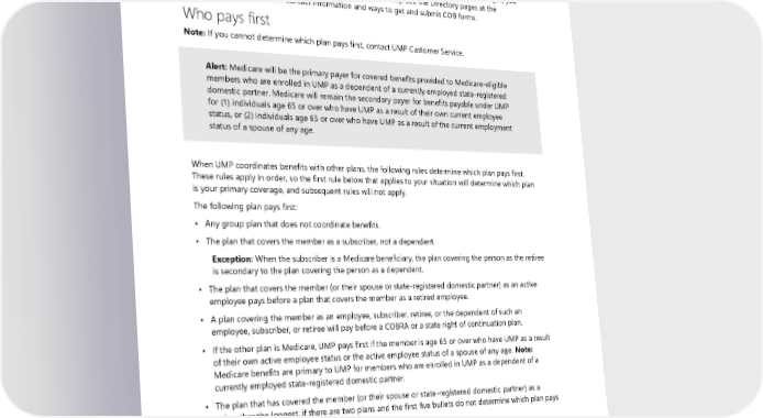 Contact UMP and WSRxS If you or your dependents have other insurance, you must let UMP and WSRxS know so claims are processed correctly. To do this, you must complete and submit a separate form for medical services and prescription drugs. Each person claiming payment for benefits under the plan is required to give Regence and WSRxS any facts needed to apply these COB rules. If your coverage under other plans changes, you must let UMP and WSRxS know so claims are processed correctly. See the Directory pages at the beginning of this booklet for contact information and ways to get and submit COB forms. Who pays first Note: If you cannot determine which plan pays first, contact UMP Customer Service. Alert: Medicare will be the primary payer for covered benefits provided to Medicare-eligible members who are enrolled in UMP as a dependent of a currently employed state-registered domestic partner. Medicare will remain the secondary payer for benefits payable under UMP for (1) individuals age 65 or over who have UMP as a result of their own current employee status, or (2) individuals age 65 or over who have UMP as a result of the current employment status of a spouse of any age. When UMP coordinates benefits with other plans, the following rules determine which plan pays first. These rules apply in order, so the first rule below that applies to your situation will determine which plan is your primary coverage, and subsequent rules will not apply. The following plan pays first: • Any group plan that does not coordinate benefits. • The plan that covers the member as a subscriber, not a dependent. Exception: When the subscriber is a Medicare beneficiary, the plan covering the person as the retiree is secondary to the plan covering the person as a dependent. • The plan that covers the member (or their spouse or state-registered domestic partner) as an active employee pays before a plan that covers the member as a retired employee. • A plan covering the member as an employee, subscriber, retiree, or the dependent of such an employee, subscriber, or retiree will pay before a COBRA or a state right of continuation plan. • If the other plan is Medicare, UMP pays first if the member is age 65 or over who have UMP as a result of their own active employee status or the active employee status of a spouse of any age. Note: Medicare benefits are primary to UMP for members who are enrolled in UMP as a dependent of a currently employed state-registered domestic partner. • The plan that has covered the member (or their spouse or state-registered domestic partner) as a subscriber the longest, if there are two plans and the first five bullets do not determine which plan pays first. • If none of the preceding rules determines the order of benefits, the allowable expenses must be shared equally between the plans. For dependent children A group plan is usually primary over Medicaid programs that cover children. If a dependent child has group coverage through their employer, the child’s coverage pays first. 120 2024 UMP Select (PEBB) Certificate of Coverage