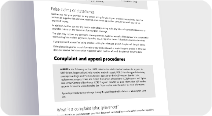 You must submit prescription drug claims within 12 months of purchase. The plan will not pay claims for prescription drugs submitted more than 12 months after purchase or prescription drugs purchased from an excluded pharmacy. See the definition of “Excluded pharmacy.” ALERT! If you do not show your UMP member ID card when purchasing a prescription at a network pharmacy, you will have to pay the full cash price and submit a Prescription Drug Claim Form. You will not receive the plan discount. False claims or statements Neither you nor your provider (or any person acting for you or your provider) may submit a claim for services or supplies that were not received, were resold to another party, or for which you are not expected to pay. In addition, neither you nor any person acting for you may make any false or incomplete statements or any false claims on any document for your plan coverage. The plan may recover any payments or overpayments made because of a false claim or false statement by withholding future claim payments, by suing you, or by other means. False claims may also be crimes. If you represent yourself as being enrolled in this plan when you are not, the plan will deny all claims. If the plan asks you for more information, you will be allowed at least 45 days to provide it. If the plan does not receive the information requested within the time allowed, the plan will deny the claim. Complaint and appeal procedures ALERT! In the following section, UMP refers to the administrative functions for appeals for UMP Select. Regence BlueShield handles medical appeals; WSRxS handles appeals involving prescription drugs; and Premera handles appeals for the COE Program. See the “Joint replacement surgery, knees and hips in the Centers of Excellence (COE) Program” and “Spine care in the Centers of Excellence (COE) Program” benefits for more information. VSP handles appeals for routine vision benefits. See “Your routine vision benefits” for more information. Appeals procedures may change during the year if required by federal or Washington State law. What is a complaint (aka: grievance)? A complaint is an oral statement or written document submitted by or on behalf of a member regarding: • Dissatisfaction with medical care. • Dissatisfaction with service provided by the health plan. • Provider or staff attitude or demeanor. • Waiting time for medical services. Note: If your issue is regarding a denial, reduction, or termination of payment or nonprovision of medical services, it is an appeal. 2024 UMP Select (PEBB) Certificate of Coverage 127