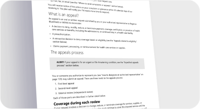 How to submit a complaint (aka: grievance) For all medical complaints, it’s recommended that you first contact UMP Customer Service. For prescription drug complaints or grievances, we recommend contacting WSRxS Customer Service. Many issues may be resolved with a phone call. If an initial phone call does not resolve your complaint, you may submit your complaint: • Over the phone: If you want a written response, you must request one. • By mail, fax, or email (see the “Where to send complaints or appeals” section below). You will receive notice of the action on your complaint or grievance within 30 calendar days of our receiving it. The plan will notify you if it needs more time to respond. What is an appeal? An appeal is an oral or written request submitted by you or your authorized representative to Regence BlueShield or WSRxS to reconsider: • A decision to deny, modify, reduce, or terminate payment, coverage, certification, or provision of health care services or benefits, including the admission to, or continued stay in, a health care facility. • A preauthorization. • A retroactive decision to deny coverage based on eligibility (see the “Appeals related to eligibility” section below). • Claims payment, processing, or reimbursement for health care services or supplies. The appeals process ALERT! If your appeal is for an urgent or life-threatening condition, see the "Expedited appeals process" section below. You or someone you authorize to represent you (see “How to designate an authorized representative” on page 139) may submit an appeal. There are three levels to the appeals process: 1. First-level appeal 2. Second-level appeal 3. External review (independent review) Each of those parts are described in further detail below. Coverage during each review If your request involves a decision to change, reduce, or terminate coverage for services, supplies, or prescription drugs already being covered, the plan must continue to cover the disputed service until the outcome of the review. If the plan upholds the decision to change, reduce, or terminate coverage, you will be responsible for the cost of the services received during the review period. If you request payment for denied claims or approval of services, supplies, or prescription drugs not yet covered by the plan, the plan will not cover the services, supplies, or prescription drugs while the appeal is under consideration. 128 2024 UMP Select (PEBB) Certificate of Coverage
