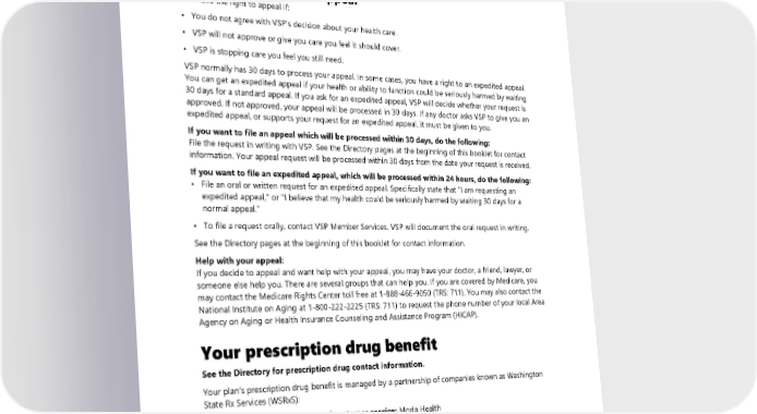 Vision complaints and appeals How to submit a vision complaint Complaints can be submitted through a written or verbal request. See the Directory pages at the beginning of this booklet for links and contact information. How to submit a vision appeal You have the right to appeal if: • You do not agree with VSP's decision about your health care. • VSP will not approve or give you care you feel it should cover. • VSP is stopping care you feel you still need. VSP normally has 30 days to process your appeal. In some cases, you have a right to an expedited appeal. You can get an expedited appeal if your health or ability to function could be seriously harmed by waiting 30 days for a standard appeal. If you ask for an expedited appeal, VSP will decide whether your request is approved. If not approved, your appeal will be processed in 30 days. If any doctor asks VSP to give you an expedited appeal, or supports your request for an expedited appeal, it must be given to you. If you want to file an appeal which will be processed within 30 days, do the following: File the request in writing with VSP. See the Directory pages at the beginning of this booklet for contact information. Your appeal request will be processed within 30 days from the date your request is received. If you want to file an expedited appeal, which will be processed within 24 hours, do the following: • File an oral or written request for an expedited appeal. Specifically state that "I am requesting an expedited appeal," or "I believe that my health could be seriously harmed by waiting 30 days for a normal appeal." • To file a request orally, contact VSP Member Services. VSP will document the oral request in writing. See the Directory pages at the beginning of this booklet for contact information. Help with your appeal: If you decide to appeal and want help with your appeal, you may have your doctor, a friend, lawyer, or someone else help you. There are several groups that can help you. If you are covered by Medicare, you may contact the Medicare Rights Center toll free at 1-888-466-9050 (TRS: 711). You may also contact the National Institute on Aging at 1-800-222-2225 (TRS: 711) to request the phone number of your local Area Agency on Aging or Health Insurance Counseling and Assistance Program (HICAP). Your prescription drug benefit See the Directory for prescription drug contact information. Your plan’s prescription drug benefit is managed by a partnership of companies known as Washington State Rx Services (WSRxS): • Preauthorization, appeals, and customer service: Moda Health • Network mail-order pharmacies: ▪ Costco Mail-Order Pharmacy ▪ Postal Prescription Services (PPS) ▪ Note: The plan does not cover prescription drugs purchased through mail-order pharmacies located outside the U.S. 2024 UMP Select (PEBB) Certificate of Coverage 85
