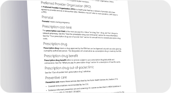 Preferred provider(s) A preferred provider is a provider: • In the Regence service area and contracted as part of Regence BlueShield’s PPO network; or • Outside the Regence service area and contracted with another Blue Cross or Blue Shield organization in the BlueCard® Program (designated as a Provider in the “Preferred Provider Organization (“PPO”) Network”) to provide services and supplies to plan members. Preferred Provider Organization (PPO) A Preferred Provider Organization (PPO) is a health plan that has a network of providers who have agreed to provide services at discounted rates. Members may self-refer to most specialists. UMP Select is a PPO. Prenatal Prenatal means during pregnancy. Prescription cost-limit The prescription cost-limit is the most you pay for a Value Tier drug, Tier 1 drug, and Tier 2 drug at a network pharmacy. See the “How the prescription drug cost-limit works” section for more information. See the “Your prescription drug out-of-pocket limit” section for annual limits to covered prescription drug costs. Prescription drug Prescription drug means a drug approved by the FDA that can be dispensed only with an order given by a properly authorized person. The designation of a medication as a prescription drug is made by the FDA. Prescription drug benefit Prescription drug benefit refers to services subject to your prescription drug deductible and coinsurance. See the “What you pay for prescription drugs” section for a description of how this works. Prescription drug out-of-pocket limit See the “Out-of-pocket limit, prescription drug” definition. Preventive care Preventive care means those services described by the Public Health Services Act, Section 2713: • Covered immunizations recommended by the CDC. • Evidence-informed preventive care and screenings for women as described in HRSA Guidelines in accordance with 45 CFR §147.130 (a)(iv). • Evidence-informed preventive care screenings for infants, children, and adolescents supported by the Health Resources and Services Administration (HRSA). • Services with an A or B rating by the U.S. Preventive Services Task Force. 190 2024 UMP Select (PEBB) Certificate of Coverage