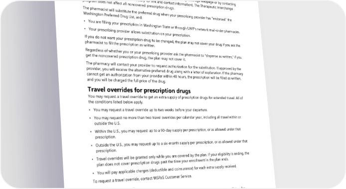 Therapeutic Interchange Program The Washington State Therapeutic Interchange Program allows a pharmacist to substitute a “therapeutic alternative” drug for a noncovered drug in certain cases. Therapeutic alternatives are drugs that are chemically different from your prescribed drug but provide the same therapeutic benefit. You may find out if your prescription drug is affected by the Therapeutic Interchange Program by checking the UMP Preferred Drug List on the UMP Prescription drug coverage webpage or by contacting WSRxS Customer Service (see Directory for link and contact information). The Therapeutic Interchange program does not affect all noncovered prescription drugs. The pharmacist will substitute the preferred drug when your prescribing provider has “endorsed” the Washington Preferred Drug List, and: • You are filling your prescription in Washington State or through UMP’s network mail-order pharmacies. • Your prescribing provider allows substitution on your prescription. If you do not want your prescription drug to be changed, the plan may not cover your drug if you ask the pharmacist to fill the prescription as written. Regardless of whether you or your prescribing provider ask the pharmacist to “dispense as written,” if you get the noncovered prescription drug, the plan may not cover it. The pharmacy will contact your provider to request authorization for the substitution. If approved by the provider, you will receive the alternative preferred drug along with a letter of explanation. If the pharmacy cannot get an authorization from your provider within 48 hours, the prescription will be filled as written, and you will be charged the full price of the drug. Travel overrides for prescription drugs You may request a travel override to get an extra supply of prescription drugs for extended travel. All of the conditions listed below apply. • You may request a travel override up to two weeks before your departure. • You may request no more than two travel overrides per calendar year, including all travel within or outside the U.S. • Within the U.S., you may request up to a 90-day supply per prescription, or as allowed under that prescription. • Outside the U.S., you may request up to a six-month supply per prescription, or as allowed under that prescription. • Travel overrides will be granted only while you are covered by the plan. If your eligibility is ending, the plan does not cover prescription drugs past the time your enrollment in the plan ends. • You will pay applicable charges (deductible and coinsurance) for each extra supply received. To request a travel override, contact WSRxS Customer Service. Refill too soon The plan will not cover a refill until 84 percent of the last prescription should be used up. Claims for therapeutic equivalents of the previously prescribed drug will also be denied. This also applies if your prescription is damaged, destroyed, lost, or stolen. For example, if you get a 90-day supply and you try to refill this prescription before 76 days have passed, coverage will be denied. However, in the event of an emergency or other urgent circumstance, you may request an exception to override the refill too soon policy. The plan may require documentation to support your request. Approval of your request is at the sole discretion of the plan. 104 2024 UMP Select (PEBB) Certificate of Coverage