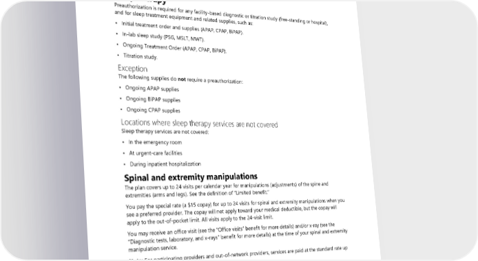 Private duty nursing is shift-based, hourly nursing care at home for adults and children, typically with a chronic illness, injury, or disability. Substitution of private duty nursing in lieu of placement in a skilled nursing facility has the same requirements and limitations as the facility benefit. For example, all deductibles and coinsurances apply and the benefit is limited to the equivalent of a maximum of 150 skilled nursing facility days per calendar year. Sleep therapy Preauthorization is required for any facility-based diagnostic or titration study (free-standing or hospital), and for sleep treatment equipment and related supplies, such as: • Initial treatment order and supplies (APAP, CPAP, BiPAP). • In-lab sleep study (PSG, MSLT, MWT). • Ongoing Treatment Order (APAP, CPAP, BiPAP). • Titration study. Exception The following supplies do not require a preauthorization: • Ongoing APAP supplies • Ongoing BiPAP supplies • Ongoing CPAP supplies Locations where sleep therapy services are not covered Sleep therapy services are not covered: • In the emergency room • At urgent-care facilities • During inpatient hospitalization Spinal and extremity manipulations The plan covers up to 24 visits per calendar year for manipulations (adjustments) of the spine and extremities (arms and legs). See the definition of “Limited benefit.” You pay the special rate (a $15 copay) for up to 24 visits for spinal and extremity manipulations when you see a preferred provider. The copay will not apply toward your medical deductible, but the copay will apply to the out-of-pocket limit. All visits apply to the 24-visit limit. You may receive an office visit (see the “Office visits” benefit for more details) and/or x-ray (see the “Diagnostic tests, laboratory, and x-rays” benefit for more details) at the time of your spinal and extremity manipulation service. Note: For participating providers and out-of-network providers, services are paid at the standard rate up to 24 visits per calendar year. Spinal injections The plan must preauthorize some spinal injections (see the “Limits on plan coverage” section for how this works). The following therapeutic injections are covered for treatment of chronic pain: • Cervical-thoracic epidural injections • Lumbar epidural injections 68 2024 UMP Select (PEBB) Certificate of Coverage