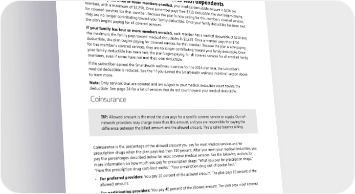 • Routine vision care: exams, glasses, and contacts. • Second opinions required by the plan. • Tobacco cessation services. Note: See page 92 for prescription drug deductible exemptions. How your medical deductible works with dependents If your family has three or fewer members enrolled, your medical deductible amount is $750 per member, with a maximum of $2,250. Once a member pays their $750 deductible, the plan begins paying for covered services for that member. Because the plan is now paying for this member’s covered services, they are no longer contributing toward your family deductible. Once your family deductible has been met, the plan begins paying for all covered services. If your family has four or more members enrolled, each member has a medical deductible of $750 and the maximum the family pays toward medical deductibles is $2,250. Once a member pays their $750 deductible, the plan begins paying for covered services for that member. Because the plan is now paying for this member’s covered services, they are no longer contributing toward your family deductible. Once your family deductible has been met, the plan begins paying for all covered services for all enrolled family members, even if some have not met their own deductible. If the subscriber earned the SmartHealth wellness incentive for the 2024 plan year, the subscriber’s medical deductible is reduced. See the “If you earned the SmartHealth wellness incentive” section above to learn more. Note: Only services that are covered and are subject to your medical deductible count toward the deductible. See page 24 for a list of services that do not count toward your medical deductible. Coinsurance TIP: Allowed amount is the most the plan pays for a specific covered service or supply. Out-of- network providers may charge more than this amount, and you are responsible for paying the difference between the billed amount and the allowed amount. This is called balance billing. Coinsurance is the percentage of the allowed amount you pay for most medical services and for prescription drugs when the plan pays less than 100 percent. After you meet your medical deductible, you pay the percentages described below for most covered medical services. See the following sections for more information on how much you pay for prescription drugs: “What you pay for prescription drugs,” “How the prescription drug cost-limit works,” “Your prescription drug out-of-pocket limit.” • For preferred providers: You pay 20 percent of the allowed amount. The plan pays 80 percent of the allowed amount. • For participating providers: You pay 40 percent of the allowed amount. The plan pays most covered services at 60 percent of the allowed amount. • For out-of-network providers: You pay 40 percent of the allowed amount, and the provider may balance bill you. The plan pays most covered services at 60 percent of the allowed amount. Professional charges, such as for physician services while you are in the hospital or lab work, may be billed separately. Note: When you receive nonemergency services at a network hospital, network hospital outpatient department, network critical access hospital, or network ambulatory surgical center in Washington State, 2024 UMP Select (PEBB) Certificate of Coverage 25