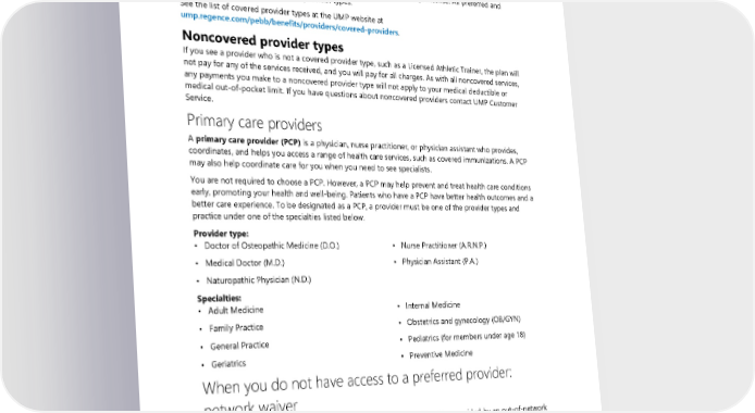 Covered and noncovered provider types Covered provider types The plan pays the allowed amount for covered services only when performed by covered provider types within the scope of their license(s). When a facility charges facility fees, the plan pays the allowed amount if the services are covered services and are within the scope of the facility’s license. All preferred and participating providers are covered provider types. See the list of covered provider types at the UMP website at ump.regence.com/pebb/benefits/providers/covered-providers. Noncovered provider types If you see a provider who is not a covered provider type, such as a Licensed Athletic Trainer, the plan will not pay for any of the services received, and you will pay for all charges. As with all noncovered services, any payments you make to a noncovered provider type will not apply to your medical deductible or medical out-of-pocket limit. If you have questions about noncovered providers contact UMP Customer Service. Primary care providers A primary care provider (PCP) is a physician, nurse practitioner, or physician assistant who provides, coordinates, and helps you access a range of health care services, such as covered immunizations. A PCP may also help coordinate care for you when you need to see specialists. You are not required to choose a PCP. However, a PCP may help prevent and treat health care conditions early, promoting your health and well-being. Patients who have a PCP have better health outcomes and a better care experience. To be designated as a PCP, a provider must be one of the provider types and practice under one of the specialties listed below. Provider type: • Doctor of Osteopathic Medicine (D.O.) • Nurse Practitioner (A.R.N.P.) • Medical Doctor (M.D.) • Physician Assistant (P.A.) • Naturopathic Physician (N.D.) Specialties: • Adult Medicine • Internal Medicine • Family Practice • Obstetrics and gynecology (OB/GYN) • General Practice • Pediatrics (for members under age 18) • Geriatrics • Preventive Medicine When you do not have access to a preferred provider: network waiver An approved network waiver allows the plan to pay for covered services provided by an out-of-network provider at the network rate. You may request a network waiver only when you do not have access to a preferred provider able to provide covered medically necessary services within 30 miles of your residence. A service or supply prescribed, ordered, recommended, approved, or given by a provider does not make it a medically necessary covered service or supply. 18 2024 UMP Select (PEBB) Certificate of Coverage