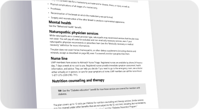 Mastectomy and breast reconstruction ALERT! See page 51 for coverage of breast reconstruction or mastectomy services related to gender affirming care. You pay the standard rate for a mastectomy as treatment for disease, illness, or injury, as well as: • Physical complications of all stages of a mastectomy. • Prostheses. • Reconstruction of the breast on which the mastectomy was performed. • Surgery and reconstruction of the other breast to produce a symmetrical appearance. Mental health See the “Behavioral health” benefit. Naturopathic physician services While naturopaths are a covered provider type, naturopaths may recommend services that the plan does not cover. You will pay all costs for excluded and non-medically necessary services, even if your naturopathic physician recommends or prescribes them (see the “Medically necessary or medical necessity” definition for more information). The plan does not cover herbal, homeopathic, or other dietary supplements (including vitamins and minerals, except as described on page 89), even if a covered provider type prescribes them. Nurse line UMP members have access to Advice24 Nurse Triage. Registered nurses are available by phone 24 hours a day, 7 days a week at no cost to you. Registered nurses provide immediate symptom assessment, health information, and advice. They can help you decide if you need to go to the emergency room, see a doctor either virtually or in-person, or care for your symptoms at home. UMP members can call the nurse line at 1-877-375-2599 (TRS: 711). Nutrition counseling and therapy TIP: See the “Diabetes education” benefit for how these services are covered for members with diabetes. The plan covers up to 12 visits per lifetime for nutrition counseling and therapy services. Similar services may be covered under other benefits that are not subject to the 12-visit limit, including, but not limited to, the “Diabetes Control Program,” “Diabetes education,” and the “Diabetes Prevention Program.” Obstetric and newborn care Pregnancy program As an expectant parent, the program helps you manage your health throughout pregnancy and offers access to a nurse line, pregnancy support, and education 24 hours a day, 7 days a week. It also includes a smartphone application to help you track milestones, identify symptoms, access education, and get one- 2024 UMP Select (PEBB) Certificate of Coverage 61