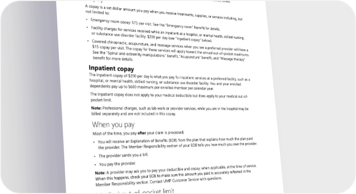 you pay the network rate and cannot be balance billed regardless of the network status of the provider. For nonemergency services performed at one of these facilities outside of Washington State, you still pay the network rate, but in some states, an out-of-network provider may be allowed to ask you to waive some of your balance billing protections. At an out-of-network facility, when you receive emergency services you pay the network cost-sharing amount regardless of the network status of the provider or facility and cannot be balance billed. Copay A copay is a set dollar amount you pay when you receive treatments, supplies, or services including, but not limited to: • Emergency room copay: $75 per visit. See the “Emergency room” benefit for details. • Facility charges for services received while an inpatient at a hospital, or mental health, skilled nursing, or substance use disorder facility: $200 per day (see “Inpatient copay” below). • Covered chiropractic, acupuncture, and massage services when you see a preferred provider will have a $15 copay per visit. The copay for these services will apply toward the annual out-of-pocket maximums. See the “Spinal and extremity manipulations” benefit, “Acupuncture” benefit, and “Massage therapy” benefit for more details. Inpatient copay The inpatient copay of $200 per day is what you pay for inpatient services at a preferred facility, such as a hospital, or mental health, skilled nursing, or substance use disorder facility. You and your enrolled dependents pay up to $600 maximum per enrolled member per calendar year. The inpatient copay does not apply to your medical deductible but does apply to your medical out-of- pocket limit. Note: Professional charges, such as lab work or provider services, while you are in the hospital may be billed separately and are not included in this copay. When you pay Most of the time, you pay after your claim is processed. • You will receive an Explanation of Benefits (EOB) from the plan that explains how much the plan paid the provider. The Member Responsibility section of your EOB tells you how much you owe the provider. • The provider sends you a bill. • You pay the provider. Note: A provider may ask you to pay your deductible and copay, when applicable, at the time of service. When this happens, check your EOB to make sure the amount you paid is accurately reflected in the Member Responsibility section. Contact UMP Customer Service with questions. Medical out-of-pocket limit ALERT! Prescription drug costs do not apply to your medical out-of-pocket limit (see below). The medical out-of-pocket limit is the most you pay during a calendar year for covered services from preferred providers. After you meet your medical out-of-pocket limit for the year, the plan pays for 26 2024 UMP Select (PEBB) Certificate of Coverage