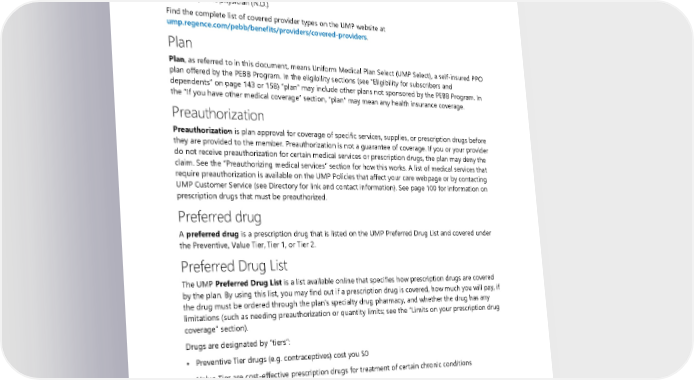 Physician services Physician services are health care services provided or coordinated by a licensed medical physician, such as a: • Doctor of osteopathic medicine (D.O.) • Medical doctor (M.D.) • Naturopathic physician (N.D.) Find the complete list of covered provider types on the UMP website at ump.regence.com/pebb/benefits/providers/covered-providers. Plan Plan, as referred to in this document, means Uniform Medical Plan Select (UMP Select), a self-insured PPO plan offered by the PEBB Program. In the eligibility sections (see “Eligibility for subscribers and dependents” on page 143 or 158) “plan” may include other plans not sponsored by the PEBB Program. In the “If you have other medical coverage” section, “plan” may mean any health insurance coverage. Preauthorization Preauthorization is plan approval for coverage of specific services, supplies, or prescription drugs before they are provided to the member. Preauthorization is not a guarantee of coverage. If you or your provider do not receive preauthorization for certain medical services or prescription drugs, the plan may deny the claim. See the “Preauthorizing medical services” section for how this works. A list of medical services that require preauthorization is available on the UMP Policies that affect your care webpage or by contacting UMP Customer Service (see Directory for link and contact information). See page 100 for information on prescription drugs that must be preauthorized. Preferred drug A preferred drug is a prescription drug that is listed on the UMP Preferred Drug List and covered under the Preventive, Value Tier, Tier 1, or Tier 2. Preferred Drug List The UMP Preferred Drug List is a list available online that specifies how prescription drugs are covered by the plan. By using this list, you may find out if a prescription drug is covered, how much you will pay, if the drug must be ordered through the plan’s specialty drug pharmacy, and whether the drug has any limitations (such as needing preauthorization or quantity limits; see the ”Limits on your prescription drug coverage” section). Drugs are designated by “tiers”: • Preventive Tier drugs (e.g. contraceptives) cost you $0 • Value Tier are cost-effective prescription drugs for treatment of certain chronic conditions • Tier 1 are primarily generic prescription drugs • Tier 2 are preferred brand-name prescription drugs and some high-cost generic drugs The UMP Preferred Drug List is based on the Washington Preferred Drug List and recommendations by one of the P&T Committees that partner with WSRxS (see the “How UMP decides which prescription drugs are preferred” section for more information). 2024 UMP Select (PEBB) Certificate of Coverage 189