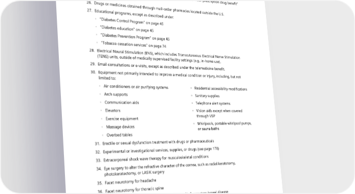 ◦ Isthmic spondylolysis ◦ Primary neurogenic claudication associated with stenosis ◦ Radiculopathy ◦ Spondylolisthesis greater than Grade 1 25. Drugs or medicines not covered by the plan, as described in the “Your prescription drug benefit” section, see pages 85-106 26. Drugs or medicines obtained through mail-order pharmacies located outside the U.S. 27. Educational programs, except as described under: ◦ “Diabetes Control Program” on page 45 ◦ “Diabetes education” on page 45 ◦ “Diabetes Prevention Program” on page 45 ◦ “Tobacco cessation services” on page 74 28. Electrical Neural Stimulation (ENS), which includes Transcutaneous Electrical Nerve Stimulation (TENS) units, outside of medically supervised facility settings (e.g., in-home use). 29. Email consultations or e-visits, except as described under the telemedicine benefit. 30. Equipment not primarily intended to improve a medical condition or injury, including, but not limited to: ◦ Air conditioners or air purifying systems ◦ Residential accessibility modifications ◦ Arch supports ◦ Sanitary supplies ◦ Communication aids ◦ Telephone alert systems ◦ Elevators ◦ Vision aids except when covered ◦ Exercise equipment through VSP ◦ Massage devices ◦ Whirlpools, portable whirlpool pumps, ◦ Overbed tables or sauna baths 31. Erectile or sexual dysfunction treatment with drugs or pharmaceuticals 32. Experimental or investigational services, supplies, or drugs (see page 178) 33. Extracorporeal shock wave therapy for musculoskeletal conditions 34. Eye surgery to alter the refractive character of the cornea, such as radial keratotomy, photokeratectomy, or LASIK surgery 35. Facet neurotomy for headache 36. Facet neurotomy for thoracic spine 37. Fecal microbiota transplantation for treatment of inflammatory bowel disease 38. Foot care not related to diabetes: Toenail cutting; diagnosed corns and calluses treatment; or any other maintenance-related foot care 39. Functional neuroimaging for primary degenerative dementia or mild cognitive impairment 40. Gene expression profile testing for multiple myeloma or colon cancer 41. Headaches: 2024 UMP Select (PEBB) Certificate of Coverage 111