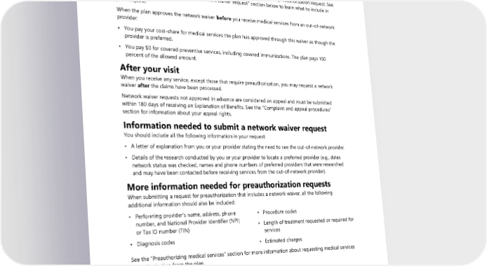 When and how to request a network waiver Before your visit When services require preauthorization, you may request a network waiver before services are provided. Visit the UMP Policies that affect your care webpage for the list of services requiring preauthorization (see Directory for link). Your network waiver request should be included with the preauthorization request. See the “Information needed to submit a network waiver request” section below to learn what to include in your request. When the plan approves the network waiver before you receive medical services from an out-of-network provider: • You pay your cost-share for medical services the plan has approved through this waiver as though the provider is preferred. • You pay $0 for covered preventive services, including covered immunizations. The plan pays 100 percent of the allowed amount. After your visit When you receive any service, except those that require preauthorization, you may request a network waiver after the claims have been processed. Network waiver requests not approved in advance are considered an appeal and must be submitted within 180 days of receiving an Explanation of Benefits. See the “Complaint and appeal procedures” section for information about your appeal rights. Information needed to submit a network waiver request You should include all the following information in your request: • A letter of explanation from you or your provider stating the need to see the out-of-network provider. • Details of the research conducted by you or your provider to locate a preferred provider (e.g., dates network status was checked, names and phone numbers of preferred providers that were researched and may have been contacted before receiving services from the out-of-network provider). More information needed for preauthorization requests When submitting a request for preauthorization that includes a network waiver, all the following additional information should also be included: • Performing provider’s name, address, phone • Procedure codes number, and National Provider Identifier (NPI) • Length of treatment requested or required for or Tax ID number (TIN) services • Diagnosis codes • Estimated charges See the “Preauthorizing medical services” section for more information about requesting medical services preauthorization from the plan. Where to send your network waiver request UMP Member Appeals Regence BlueShield PO Box 1106 Lewiston, ID 83501-1106 If you have questions about the network waiver process, contact UMP Customer Service. 2024 UMP Select (PEBB) Certificate of Coverage 19