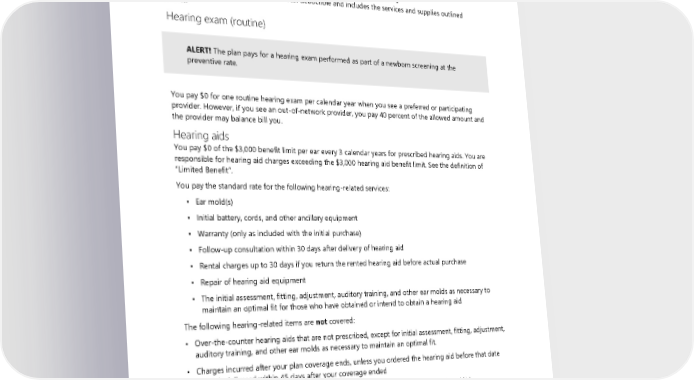 Hearing care (diseases and disorders of the ear) The plan pays under the medical benefit for covered services for treatment of diseases and disorders of the ear or auditory canal not related to routine hearing loss. These services are not part of the “Hearing exam and hearing aids” benefit. Hearing exam and hearing aids (instruments) This benefit is not subject to your medical deductible and includes the services and supplies outlined below. Hearing exam (routine) ALERT! The plan pays for a hearing exam performed as part of a newborn screening at the preventive rate. You pay $0 for one routine hearing exam per calendar year when you see a preferred or participating provider. However, if you see an out-of-network provider, you pay 40 percent of the allowed amount and the provider may balance bill you. Hearing aids You pay $0 of the $3,000 benefit limit per ear every 3 calendar years for prescribed hearing aids. You are responsible for hearing aid charges exceeding the $3,000 hearing aid benefit limit. See the definition of “Limited Benefit”. You pay the standard rate for the following hearing-related services: ▪ Ear mold(s) ▪ Initial battery, cords, and other ancillary equipment ▪ Warranty (only as included with the initial purchase) ▪ Follow-up consultation within 30 days after delivery of hearing aid ▪ Rental charges up to 30 days if you return the rented hearing aid before actual purchase ▪ Repair of hearing aid equipment ▪ The initial assessment, fitting, adjustment, auditory training, and other ear molds as necessary to maintain an optimal fit for those who have obtained or intend to obtain a hearing aid The following hearing-related items are not covered: • Over-the-counter hearing aids that are not prescribed, except for initial assessment, fitting, adjustment, auditory training, and other ear molds as necessary to maintain an optimal fit. • Charges incurred after your plan coverage ends, unless you ordered the hearing aid before that date and it is delivered within 45 days after your coverage ended • Extended warranties, or warranties not related to the initial purchase of the hearing aid(s) • Purchase of replacement batteries or other ancillary equipment, except those covered under terms of the initial hearing aid purchase The following ancillary equipment is not covered: • Alerting devices 52 2024 UMP Select (PEBB) Certificate of Coverage