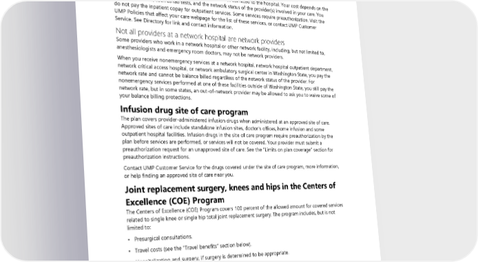 Private duty nursing is shift-based, hourly nursing care at home for adults and children, typically with a chronic illness, injury, or disability. Substitution of private duty nursing in lieu of inpatient hospitalization has the same requirements as the hospital benefit. For example, all deductibles and coinsurances apply. Outpatient Services are considered “outpatient” when you are not admitted to the hospital. Your cost depends on the services provided, such as lab tests, and the network status of the provider(s) involved in your care. You do not pay the inpatient copay for outpatient services. Some services require preauthorization. Visit the UMP Policies that affect your care webpage for the list of these services, or contact UMP Customer Service. See Directory for link and contact information. Not all providers at a network hospital are network providers Some providers who work in a network hospital or other network facility, including, but not limited to, anesthesiologists and emergency room doctors, may not be network providers. When you receive nonemergency services at a network hospital, network hospital outpatient department, network critical access hospital, or network ambulatory surgical center in Washington State, you pay the network rate and cannot be balance billed regardless of the network status of the provider. For nonemergency services performed at one of these facilities outside of Washington State, you still pay the network rate, but in some states, an out-of-network provider may be allowed to ask you to waive some of your balance billing protections. Infusion drug site of care program The plan covers provider-administered infusion drugs when administered at an approved site of care. Approved sites of care include standalone infusion sites, doctor's offices, home infusion and some outpatient hospital facilities. Infusion drugs in the site of care program require preauthorization by the plan before services are performed, or services will not be covered. Your provider must submit a preauthorization request for an unapproved site of care. See the “Limits on plan coverage” section for preauthorization instructions. Contact UMP Customer Service for the drugs covered under the site of care program, more information, or help finding an approved site of care near you. Joint replacement surgery, knees and hips in the Centers of Excellence (COE) Program The Centers of Excellence (COE) Program covers 100 percent of the allowed amount for covered services related to single knee or single hip total joint replacement surgery. The program includes, but is not limited to: • Presurgical consultations. • Travel costs (see the “Travel benefits” section below). • Hospitalization and surgery, if surgery is determined to be appropriate. • Postsurgical check-ups. In the COE program, members work with Premera Blue Cross (the administrator of the program) and Virginia Mason Medical Center (the Center of Excellence) to make sure that their treatment is consistent with established standards of medical care. 56 2024 UMP Select (PEBB) Certificate of Coverage