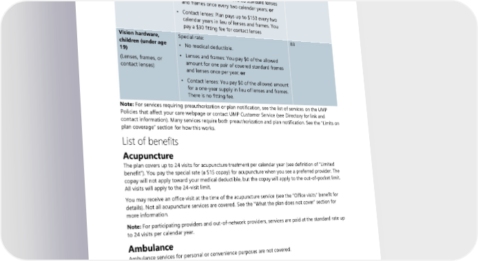 Benefit/service How much you will pay For information, see page(s): Vision hardware, Special rate: 80 adults (age 19 or • No medical deductible older) • Lenses and frames: You pay $0 of the allowed (Lenses, frames, or amount for one pair of covered standard lenses contact lenses) and frames once every two calendar years; or • Contact lenses: Plan pays up to $150 every two calendar years in lieu of lenses and frames. You pay a $30 fitting fee for contact lenses Vision hardware, Special rate: 83 children (under age • No medical deductible. 19) • Lenses and frames: You pay $0 of the allowed (Lenses, frames, or amount for one pair of covered standard frames contact lenses) and lenses once per year; or • Contact lenses: You pay $0 of the allowed amount for a one-year supply in lieu of lenses and frames. There is no fitting fee. Note: For services requiring preauthorization or plan notification, see the list of services on the UMP Policies that affect your care webpage or contact UMP Customer Service (see Directory for link and contact information). Many services require both preauthorization and plan notification. See the “Limits on plan coverage” section for how this works. List of benefits Acupuncture The plan covers up to 24 visits for acupuncture treatment per calendar year (see definition of “Limited benefit”). You pay the special rate (a $15 copay) for acupuncture when you see a preferred provider. The copay will not apply toward your medical deductible, but the copay will apply to the out-of-pocket limit. All visits will apply to the 24-visit limit. You may receive an office visit at the time of the acupuncture service (see the “Office visits” benefit for details). Not all acupuncture services are covered. See the “What the plan does not cover” section for more information. Note: For participating providers and out-of-network providers, services are paid at the standard rate up to 24 visits per calendar year. Ambulance Ambulance services for personal or convenience purposes are not covered. Ground ambulance You pay 20 percent of the allowed amount for medically necessary ambulance services. Professional ground ambulance services are covered in a medical emergency: • From the site of the medical emergency to the nearest facility equipped to treat the medical emergency. • From one facility to the nearest other facility equipped to provide treatment for your condition. 2024 UMP Select (PEBB) Certificate of Coverage 37