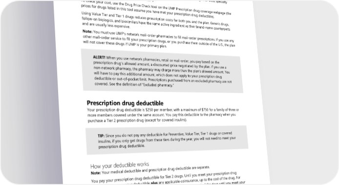 ***Preventive drugs required under Patient Protection and Affordable Care Act (PPACA) or recommended by the U.S. Preventive Services Task Force and the Advisory Committee on Immunization Practices of the CDC. You may find a prescription drug’s tier by searching the UMP Preferred Drug List on the UMP Prescription drug coverage webpage or by contacting WSRxS Customer Service (see Directory for link and contact information). You may purchase up to a 90-day supply for most prescription drugs. For most specialty drugs, you may purchase up to a 30-day supply. To check your cost, use the Drug Price Check tool on the UMP Prescription drug coverage webpage (the prices for drugs listed in this tool assume you have met your prescription drug deductible). Using Value Tier and Tier 1 drugs reduces prescription costs for both you and the plan. Generic drugs, follow-on biologics, and biosimilars have the same active ingredient as their brand-name counterparts and are usually less expensive. Note: You must use UMP’s network mail-order pharmacies to fill mail-order prescriptions. If you use any other mail-order service to fill your prescription drugs, or you purchase them outside of the U.S., the plan will not cover these drugs if UMP is your primary plan. ALERT! When you use network pharmacies, retail or mail-order, you pay based on the prescription drug’s allowed amount, a discounted price negotiated by the plan. If you use a non-network pharmacy, the pharmacy may charge more than the plan’s allowed amount. You will have to pay this additional amount, which does not apply to your prescription drug deductible or out-of-pocket limit. Prescriptions purchased from an excluded pharmacy are not covered. See the definition of “Excluded pharmacy.” Prescription drug deductible Your prescription drug deductible is $250 per member, with a maximum of $750 for a family of three or more members covered under the same account. You pay this deductible to the pharmacy when you purchase a Tier 2 prescription drug (except for covered insulins). TIP: Since you do not pay any deductible for Preventive, Value Tier, Tier 1 drugs or covered insulins, if you only get drugs from these tiers during the year, you will not need to meet your prescription drug deductible. How your deductible works Note: Your medical deductible and prescription drug deductible are separate. You pay your prescription drug deductible for Tier 2 drugs. Until you meet your prescription drug deductible, you pay your deductible plus any applicable coinsurance, up to the cost of the drug. For prescription drugs that cost less than your deductible, you pay the cost of the drug until you meet your prescription drug deductible. Note: If UMP pays second, you must still meet your prescription drug deductible before UMP covers Tier 2 drugs except for covered insulins (see “How COB works with prescription drugs” on page 123). What applies to your deductible The following paid by the member directly or paid on behalf of the member by another person including payments made through a manufacturer drug coupon or other manufacturer discount: 92 2024 UMP Select (PEBB) Certificate of Coverage