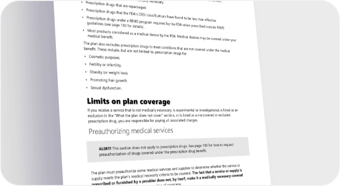 • Prescription drug costs covered by other insurance (see page 123 for coordination with other plans). • Prescription drugs not approved by the FDA. • Prescription drugs prescribed for excluded conditions. • Prescription drugs provided to a member, in whole or in part, while the member is admitted to an inpatient facility. Drugs provided in an inpatient setting are covered under the medical benefit. • Prescription drugs that are not medically necessary. • Prescription drugs that are repackaged. • Prescription drugs that the FDA’s DESI classifications have found to be less than effective. • Prescription drugs under a REMS program required by the FDA when prescribed outside REMS guidelines (see page 100 for details). • Most products considered as a medical device by the FDA. Medical devices may be covered under your medical benefit. The plan also excludes prescription drugs to treat conditions that are not covered under the medical benefit. These include, but are not limited to, prescription drugs for: • Cosmetic purposes. • Fertility or infertility. • Obesity (or weight loss). • Promoting hair growth. • Sexual dysfunction. Limits on plan coverage If you receive a service that is not medically necessary, is experimental or investigational, is listed as an exclusion in the “What the plan does not cover” section, or is listed as a noncovered or excluded prescription drug, you are responsible for paying all associated charges. Preauthorizing medical services ALERT! This section does not apply to prescription drugs. See page 100 for how to request preauthorization of drugs covered under the prescription drug benefit. The plan must preauthorize some medical services and supplies to determine whether the service or supply meets the plan’s medical necessity criteria to be covered. The fact that a service or supply is prescribed or furnished by a provider does not, by itself, make it a medically necessary covered service. Preauthorization is not a guarantee of coverage. A change after the plan has approved a preauthorization request — including, but not limited to, a change of provider or different/additional services — requires your provider to submit a new preauthorization request and for the plan to approve it. If your preauthorization is denied, your provider may request a peer-to-peer review where they can talk to a Regence BlueShield provider about your condition prior to submitting an appeal. For more information contact UMP customer service. 106 2024 UMP Select (PEBB) Certificate of Coverage