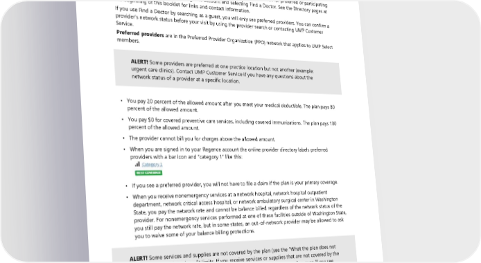 Finding a health care provider As a UMP member, you may see preferred, participating, or out-of-network providers. The amount you pay for services depends on the network status of the provider. Seeing preferred providers will save you money. Visit the UMP provider search to find UMP Select providers. You can search for preferred or participating providers by signing in to your Regence account and selecting Find a Doctor. See the Directory pages at the beginning of this booklet for links and contact information. If you use Find a Doctor by searching as a guest, you will only see preferred providers. You can confirm a provider’s network status before your visit by using the provider search or contacting UMP Customer Service. Preferred providers are in the Preferred Provider Organization (PPO) network that applies to UMP Select members. ALERT! Some providers are preferred at one practice location but not another (example: urgent care clinics). Contact UMP Customer Service if you have any questions about the network status of a provider at a specific location. • You pay 20 percent of the allowed amount after you meet your medical deductible. The plan pays 80 percent of the allowed amount. • You pay $0 for covered preventive care services, including covered immunizations. The plan pays 100 percent of the allowed amount. • The provider cannot bill you for charges above the allowed amount. • When you are signed in to your Regence account the online provider directory labels preferred providers with a bar icon and “category 1” like this: • If you see a preferred provider, you will not have to file a claim if the plan is your primary coverage. • When you receive nonemergency services at a network hospital, network hospital outpatient department, network critical access hospital, or network ambulatory surgical center in Washington State, you pay the network rate and cannot be balance billed regardless of the network status of the provider. For nonemergency services performed at one of these facilities outside of Washington State, you still pay the network rate, but in some states, an out-of-network provider may be allowed to ask you to waive some of your balance billing protections. ALERT! Some services and supplies are not covered by the plan (see the “What the plan does not cover” section) or have benefit limits. If you receive services or supplies that are not covered by the plan or you exceed your benefit limit, you will pay for those services or supplies, even if you see preferred providers. Contact UMP Customer Service to find out if a service or supply is covered. Participating providers contract with Regence BlueShield or another BlueCard® network as a participating provider. 2024 UMP Select (PEBB) Certificate of Coverage 15