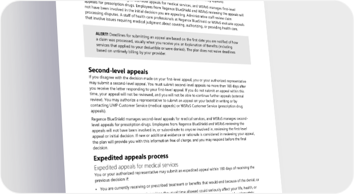 First-level appeals You or your authorized representative may submit a first-level appeal no more than 180 days after you receive the plan’s decision. If you do not submit an appeal within this time, your appeal will not be reviewed, and you will not be able to continue further appeals (second-level and external review). You may authorize a representative to submit an appeal on your behalf in writing or by contacting UMP Customer Service (medical appeals) or WSRxS Customer Service (prescription drug appeals). Regence BlueShield manages first-level appeals for medical services, and WSRxS manages first-level appeals for prescription drugs. Employees from Regence BlueShield and WSRxS reviewing the appeals will not have been involved in the initial decision you are appealing. Administrative staff review claim processing disputes. A staff of health care professionals at Regence BlueShield or WSRxS evaluate appeals that involve issues requiring medical judgment about covering, authorizing, or providing health care. ALERT! Deadlines for submitting an appeal are based on the first date you are notified of how a claim was processed, usually when you receive you an Explanation of Benefits (including services that applied to your deductible or were denied). The plan does not waive deadlines based on untimely billing by your provider. Second-level appeals If you disagree with the decision made on your first-level appeal, you or your authorized representative may submit a second-level appeal. You must submit second-level appeals no more than 180 days after you receive the letter responding to your first-level appeal. If you do not submit an appeal within this time, your appeal will not be reviewed, and you will not be able to continue further appeals (external review). You may authorize a representative to submit an appeal on your behalf in writing or by contacting UMP Customer Service (medical appeals) or WSRxS Customer Service (prescription drug appeals). Regence BlueShield manages second-level appeals for medical services, and WSRxS manages second- level appeals for prescription drugs. Employees from Regence BlueShield and WSRxS reviewing the appeals will not have been involved in, or subordinate to anyone involved in, reviewing the first-level appeal or initial decision. If new or additional evidence or rationale is considered in reviewing your appeal, the plan will provide you with this information free of charge, and you may respond before the final decision. Expedited appeals process Expedited appeals for medical services You or your authorized representative may submit an expedited appeal within 180 days of receiving the previous decision if: • You are currently receiving or prescribed treatment or benefits that would end because of the denial; or • Your provider determines that taking the usual time allowed could seriously affect your life, health, or ability to regain maximum function, or would subject you to severe pain that cannot be adequately managed without the disputed care or treatment; or • The issue is related to admission, availability of care, continued stay, or emergency health care services and you have not been discharged from the emergency room or transport service. You may authorize a representative to submit an expedited appeal on your behalf in writing or by contacting UMP Customer Service. 130 2024 UMP Select (PEBB) Certificate of Coverage