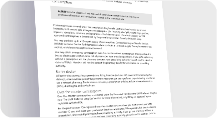 • Education and counseling related to contraception If you receive care from an out-of-network provider, covered services are paid at the standard rate and the provider may balance bill you. If you go to a non-network pharmacy, you may have to pay at the time of purchase and submit a claim for reimbursement (see the “Submitting a claim for prescription drugs” section). You must get over-the-counter contraceptive supplies from a network pharmacy for these items to be covered (see “Over-the-counter contraceptives” in the section below). Prescriptions purchased from an excluded pharmacy will not be covered. See the definition of “Excluded pharmacy.” Contraceptives ALERT! Visits for placement and removal of covered contraceptive devices that require professional insertion and removal are covered at the preventive rate. Contraceptives are covered under the prescription drug benefit. Contraceptives include, but are not limited to, birth control pills, emergency contraception (the “morning after” pill), vaginal rings, patches, implants, injectables, condoms, and spermicides. Final determination of medical necessity for FDA approved contraceptives is determined by the prescribing provider. Quantity limits still apply. You may purchase up to a 12-month supply of contraceptives. Contact Washington State Rx Services (WSRxS) Customer Service for information on how to obtain a 12-month supply. The replacement of lost, expired, or stolen contraceptives is not covered. You may obtain emergency contraception over-the-counter without a prescription. When possible, it is best to obtain a prescription, since not all pharmacies have prescribing authority. If you go to a pharmacy without a prescription and the pharmacy does not have prescribing authority, you will need to submit a claim to WSRxS. Members will need to contact the pharmacy directly for information on prescribing authority. Barrier devices All barrier devices requiring a prescription, fitting, insertion (includes IUD placement immediately after delivery), or removal are paid at the preventive rate when you see a preferred or participating provider or use a network pharmacy. Barrier devices requiring a prescription or fitting include intrauterine devices (IUDs), diaphragms, and cervical caps. Over-the-counter contraceptives Over-the-counter contraceptives are covered under the Preventive Tier (P) on the UMP Preferred Drug List (see “The UMP Preferred Drug List” section for more information), only if they are approved by and registered with the FDA. For the plan to cover FDA-registered over-the-counter contraceptives, you must present your UMP member ID card and make your purchase at the pharmacy counter. When possible, it is best to obtain a prescription, since not all pharmacies have prescribing authority. If you go to a pharmacy without a prescription and the pharmacy does not have prescribing authority, you will need to submit a claim to WSRxS. Sterilization When you see a preferred or participating provider, sterilization procedures, such as tubal ligation or vasectomy, are paid at the preventive rate and are not subject to your medical deductible. Services and products not covered under the family planning benefit The plan does not cover the following services and products as a family planning benefit: 50 2024 UMP Select (PEBB) Certificate of Coverage