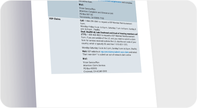 VSP complaints Call: 1-844-299-3041 Monday–Friday: 6 a.m. to 8 p.m.; Saturday: 7 a.m. to 8 p.m.; Sunday 8 a.m. to 8 p.m. (Pacific) Deaf, DeafBlind, Late Deafened and Hard of Hearing members call (TTY): 1-800-428-4833 Monday–Saturday: 6 a.m. to 5 p.m.; Sunday 5 a.m. to 8 p.m. (Pacific) Visit: VSP website at vsp.com/contact-us/grievance and complete the online form. Mail: Vision Service Plan Attention: Complaint and Grievance Unit PO Box 997100 Sacramento, CA 95899-7100 VSP Claims Call: 1-844-299-3041 to request a VSP Member Reimbursement Form. Monday–Friday: 6 a.m. to 8 p.m.; Saturday: 7 a.m. to 8 p.m.; Sunday 8 a.m. to 8 p.m. (Pacific) Deaf, DeafBlind, Late Deafened and Hard of Hearing members call (TTY): 1-800-428-4833 to request a VSP Member Reimbursement Form. If you are outside of the U.S. and you need to submit a claim form for services received outside the U.S. dial the exit code of your country, which is typically 00, and then 1-916-851-1375. Monday–Saturday: 6 a.m. to 5 p.m.; Sunday 5 a.m. to 8 p.m. (Pacific) Visit: VSP website at vsp.com/claims/submit-oon-claim and select “Start new claim” to submit an out-of-network claim online Mail: Vision Service Plan Attention: Claims Services PO Box 495918 Cincinnati, OH 45249-5918 2024 UMP Select (PEBB) Certificate of Coverage 5