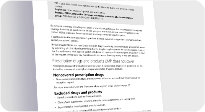 Early refill for a natural disaster You may request an early refill for your prescription when you need to evacuate for a natural disaster. To request an early refill or to locate pharmacies that remain open near you, contact WSRxS Customer Service. What to do if the plan denies coverage TIP: If your prescription coverage is denied by the pharmacy due to plan enrollment issues, contact: Employees: Your employer’s payroll or benefits office. Retirees, PEBB Continuation Coverage, and retired employees of a former employer group: PEBB Program at 1-800-200-1004 (TRS: 711). If a network pharmacy (including mail-order or specialty drug) tells you that preauthorization is required, coverage is denied, or quantities are limited, you, your pharmacist, or your prescribing provider may contact WSRxS Customer Service to request a coverage review or preauthorization. If WSRxS denies the coverage request, you have the right to submit an appeal (see the “Complaint and appeal procedures” section). If your provider thinks you need the prescription drug immediately, they may request an expedited review by submitting all clinically relevant information to the plan by phone or fax. An expedited appeal replaces the first and second level appeals. WSRxS will decide on coverage of the prescription drug within 72 hours of the request. In this case, you may choose to purchase a three-day supply at your own expense. Prescription drugs and products UMP does not cover Prescription drugs and products not covered under the prescription drug benefit include, but are not limited to, noncovered prescription drugs and excluded drugs and products. Noncovered prescription drugs • Noncovered prescription drugs are not covered without an approved UMP Preferred Drug List exception request For more information, see the “Noncovered prescription drugs” section on page 87. Excluded drugs and products • Dental preparations, such as rinses and pastes. • Dietary/food supplements, vitamins, minerals, herbal supplements, and medical foods. • Experimental or investigational prescription drugs. • Homeopathic drugs, including FDA-approved prescription products. • Over-the-counter drugs, products containing an over-the-counter drug, or prescription drugs that have a nonprescription alternative, except for the drugs specified under “Exceptions covered” on page 89, or otherwise listed on the UMP Preferred Drug List. Note: Prescription drugs with a nonprescription alternative — including an over-the-counter alternative having similar safety, efficacy, and ingredients — are excluded. • Over-the-counter products not approved by and registered with the FDA. 2024 UMP Select (PEBB) Certificate of Coverage 105