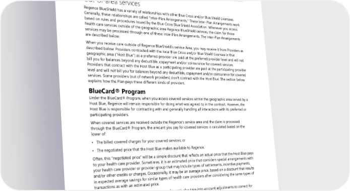 ALERT! If a network waiver is approved, you must still pay your cost-share for most medical services. Services provided under an approved network waiver are subject to your medical deductible and out-of-pocket limit. Network waivers for ongoing services may require periodic review. Out-of-area services Regence BlueShield has a variety of relationships with other Blue Cross and/or Blue Shield Licensees. Generally, these relationships are called “Inter-Plan Arrangements.” These Inter-Plan Arrangements work based on rules and procedures issued by the Blue Cross Blue Shield Association. Whenever you access health care services outside of the geographic area Regence BlueShield services, the claim for those services may be processed through one of these Inter-Plan Arrangements. The Inter-Plan Arrangements are described below. When you receive care outside of Regence BlueShield’s service Area, you may receive it from Providers as described below. Providers contracted with the local Blue Cross and/or Blue Shield Licensee in that geographic area ("Host Blue") as a preferred provider are paid at the preferred provider level and will not bill you for balances beyond any deductible, copayment and/or coinsurance for covered services. Providers that contract with the Host Blue as a participating provider are paid at the participating provider level and will not bill you for balances beyond any deductible, copayment and/or coinsurance for covered services. Some providers (out of network providers) don't contract with the Host Blue. The section below explains how the Plan pays these different kinds of providers. BlueCard® Program Under the BlueCard® Program, when you access covered services within the geographic area served by a Host Blue, Regence will remain responsible for doing what was agreed to in the contract. However, the Host Blue is responsible for contracting with and generally handling all interactions with its preferred or participating providers. When covered services are received outside the Regence’s service area and the claim is processed through the BlueCard® Program, the amount you pay for covered services is calculated based on the lower of: • The billed covered charges for your covered services; or • The negotiated price that the Host Blue makes available to Regence. Often, this “negotiated price” will be a simple discount that reflects an actual price that the Host Blue pays to your health care provider. Sometimes, it is an estimated price that considers special arrangements with your health care provider or provider group that may include types of settlements, incentive payments, and/or other credits or charges. Occasionally, it may be an average price, based on a discount that results in expected average savings for similar types of health care providers after considering the same types of transactions as with an estimated price. Estimated pricing and average pricing, going forward, also take into account adjustments to correct for over- or underestimation of modifications of past pricing of claims, as noted above. However, such adjustments will not affect the price Regence BlueShield uses for your claim because they will not be applied after a claim has already been paid. Laws in a small number of states may require the Host Blue to add a surcharge to your calculation. If any state laws mandate other liability calculation methods, including a surcharge, Regence would then calculate your liability for any covered services according to applicable law. 20 2024 UMP Select (PEBB) Certificate of Coverage