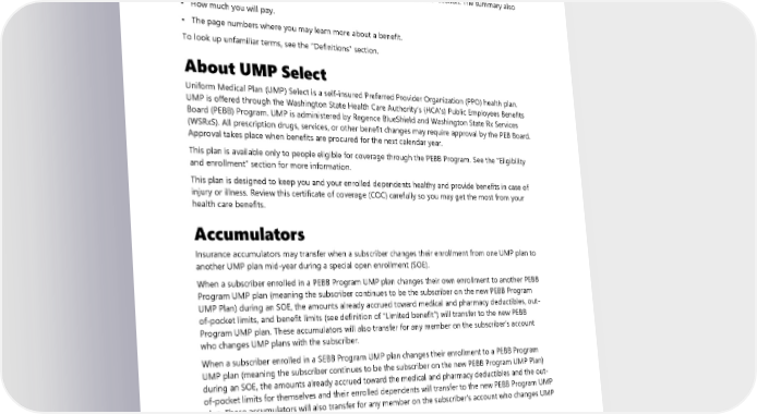 • Review prescription drug policies and programs. How to use this certificate of coverage For general topics, check the table of contents. For an overview of the most common benefits, see the “Summary of benefits” section. The summary also shows: • How much you will pay. • The page numbers where you may learn more about a benefit. To look up unfamiliar terms, see the “Definitions” section. About UMP Select Uniform Medical Plan (UMP) Select is a self-insured Preferred Provider Organization (PPO) health plan. UMP is offered through the Washington State Health Care Authority’s (HCA’s) Public Employees Benefits Board (PEBB) Program. UMP is administered by Regence BlueShield and Washington State Rx Services (WSRxS). All prescription drugs, services, or other benefit changes may require approval by the PEB Board. Approval takes place when benefits are procured for the next calendar year. This plan is available only to people eligible for coverage through the PEBB Program. See the “Eligibility and enrollment” section for more information. This plan is designed to keep you and your enrolled dependents healthy and provide benefits in case of injury or illness. Review this certificate of coverage (COC) carefully so you may get the most from your health care benefits. Accumulators Insurance accumulators may transfer when a subscriber changes their enrollment from one UMP plan to another UMP plan mid-year during a special open enrollment (SOE). When a subscriber enrolled in a PEBB Program UMP plan changes their own enrollment to another PEBB Program UMP plan (meaning the subscriber continues to be the subscriber on the new PEBB Program UMP Plan) during an SOE, the amounts already accrued toward medical and pharmacy deductibles, out- of-pocket limits, and benefit limits (see definition of “Limited benefit”) will transfer to the new PEBB Program UMP plan. These accumulators will also transfer for any member on the subscriber’s account who changes UMP plans with the subscriber. When a subscriber enrolled in a SEBB Program UMP plan changes their enrollment to a PEBB Program UMP plan (meaning the subscriber continues to be the subscriber on the new PEBB Program UMP Plan) during an SOE, the amounts already accrued toward the medical and pharmacy deductibles and the out- of-pocket limits for themselves and their enrolled dependents will transfer to the new PEBB Program UMP plan. These accumulators will also transfer for any member on the subscriber’s account who changes UMP plans with the subscriber. If you have questions, contact UMP Customer Service. 14 2024 UMP Select (PEBB) Certificate of Coverage
