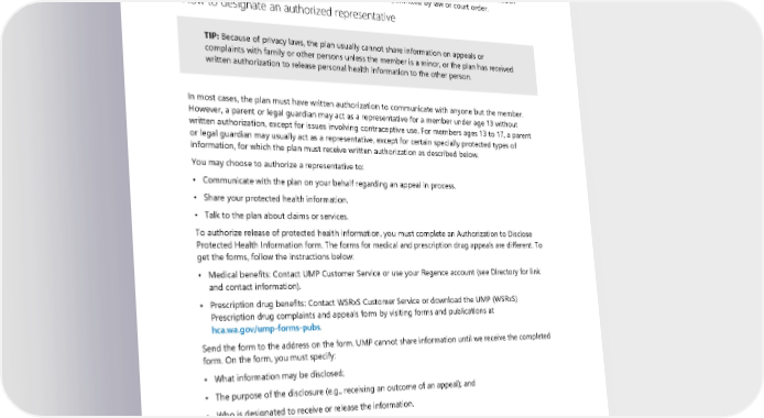pay for those services and supplies. In addition, the plan does not prevent or discourage you from talking about other health plans with your provider. Confidentiality of your health information The plan follows the UMP Notice of Privacy Practices, available online on the HCA website at hca.wa.gov/ump-privacy or by contacting UMP Customer Service. The plan will release member health information only as described in that notice or as required or permitted by law or court order. How to designate an authorized representative TIP: Because of privacy laws, the plan usually cannot share information on appeals or complaints with family or other persons unless the member is a minor, or the plan has received written authorization to release personal health information to the other person. In most cases, the plan must have written authorization to communicate with anyone but the member. However, a parent or legal guardian may act as a representative for a member under age 13 without written authorization, except for issues involving contraceptive use. For members ages 13 to 17, a parent or legal guardian may usually act as a representative, except for certain specially protected types of information, for which the plan must receive written authorization as described below. You may choose to authorize a representative to: • Communicate with the plan on your behalf regarding an appeal in process. • Share your protected health information. • Talk to the plan about claims or services. To authorize release of protected health information, you must complete an Authorization to Disclose Protected Health Information form. The forms for medical and prescription drug appeals are different. To get the forms, follow the instructions below: • Medical benefits: Contact UMP Customer Service or use your Regence account (see Directory for link and contact information). • Prescription drug benefits: Contact WSRxS Customer Service or download the UMP (WSRxS) Prescription drug complaints and appeals form by visiting forms and publications at hca.wa.gov/ump-forms-pubs. Send the form to the address on the form. UMP cannot share information until we receive the completed form. On the form, you must specify: • What information may be disclosed; • The purpose of the disclosure (e.g., receiving an outcome of an appeal); and • Who is designated to receive or release the information. Release of information The plan or HCA may require you to give information when needed to determine eligibility, administer benefits, or process claims. This could include medical and other records. The plan could deny coverage if you do not provide the information when requested. 2024 UMP Select (PEBB) Certificate of Coverage 139
