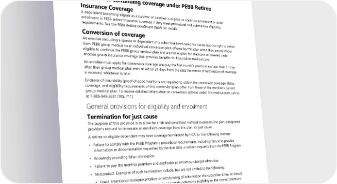 A subscriber and their dependents covered by this medical plan who lose eligibility for PEBB retiree insurance coverage when their employer group ends participation with the Health Care Authority, may be eligible to continue their enrollment under PEBB Continuation Coverage (Employer Group Ended Participation). The PEBB Program administers these coverages. Call the PEBB Program at 1‑800‑200‑1004 (TRS: 711) for details. Options for continuing coverage under PEBB Retiree Insurance Coverage A dependent becoming eligible as a survivor of a retiree is eligible to continue enrollment or defer enrollment in PEBB retiree insurance coverage if they meet procedural and substantive eligibility requirements. See the PEBB Retiree Enrollment Guide for details. Conversion of coverage An enrollee (including a spouse or dependent of a subscriber terminated for cause) has the right to switch from PEBB group medical to an individual conversion plan offered by this plan when they are no longer eligible to continue the PEBB group medical plan and are not eligible for Medicare or covered under another group insurance coverage that provides benefits for hospital or medical care. An enrollee must apply for conversion coverage and pay the first month’s premium no later than 31 days after their group medical plan ends or within 31 days from the date the notice of termination of coverage is received, whichever is later. Evidence of insurability (proof of good health) is not required to obtain the conversion coverage. Rates, coverage, and eligibility requirements of this conversion plan differ from those of the enrollee’s current group medical plan. To receive detailed information on conversion options under this medical plan, call us at 1-888-849-3681 (TRS: 711). General provisions for eligibility and enrollment Termination for just cause The purpose of this provision is to allow for a fair and consistent method to process the plan-designated provider’s request to terminate an enrollee’s coverage from this plan for just cause. A retiree or eligible dependent may have coverage terminated by HCA for the following reasons: • Failure to comply with the PEBB Program’s procedural requirements, including failure to provide information or documentation requested by the due date in written requests from the PEBB Program • Knowingly providing false information • Failure to pay the monthly premium and applicable premium surcharges when due • Misconduct. Examples of such termination include, but are not limited to the following: ▪ Fraud, intentional misrepresentation or withholding of information the subscriber knew or should have known was material or necessary to accurately determine eligibility or the correct premium ▪ Abusive or threatening conduct repeatedly directed to an HCA employee, a health plan, or other HCA-contracted vendor providing PEBB insurance coverage on behalf of HCA, its employees, or other persons If a retiree’s PEBB insurance coverage is terminated by HCA for the above reasons, PEBB insurance coverage for all of the retiree’s eligible dependents is also terminated. 2024 UMP Select (PEBB) Certificate of Coverage 171