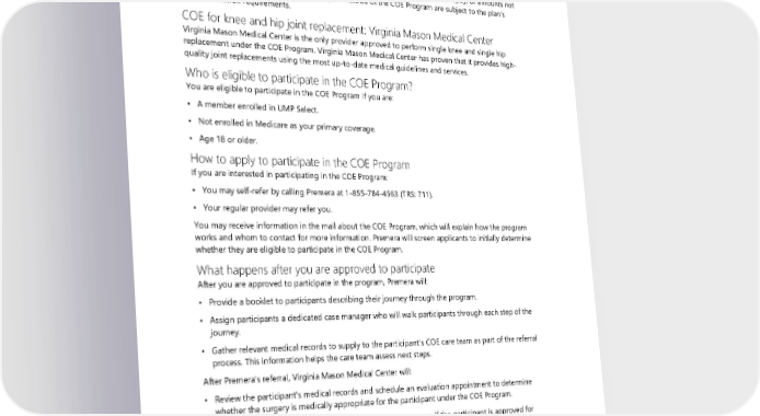 Premera will help you understand how the COE Program works, what is covered under the Program, connect you with Virginia Mason Medical Center providers if you are eligible, and work to resolve any questions or issues you may have. If you receive services related to joint replacement that are not covered under the COE Program, but are covered under the plan, you will pay your normal UMP cost-share, depending on the services received and the network status of the provider(s). This may be a deductible, coinsurance, copay, or amounts not covered by the plan. Services billed to the plan outside of the COE Program are subject to the plan’s preauthorization requirements. COE for knee and hip joint replacement: Virginia Mason Medical Center Virginia Mason Medical Center is the only provider approved to perform single knee and single hip replacement under the COE Program. Virginia Mason Medical Center has proven that it provides high- quality joint replacements using the most up-to-date medical guidelines and services. Who is eligible to participate in the COE Program? You are eligible to participate in the COE Program if you are: • A member enrolled in UMP Select. • Not enrolled in Medicare as your primary coverage. • Age 18 or older. How to apply to participate in the COE Program If you are interested in participating in the COE Program: • You may self-refer by calling Premera at 1-855-784-4563 (TRS: 711). • Your regular provider may refer you. You may receive information in the mail about the COE Program, which will explain how the program works and whom to contact for more information. Premera will screen applicants to initially determine whether they are eligible to participate in the COE Program. What happens after you are approved to participate After you are approved to participate in the program, Premera will: • Provide a booklet to participants describing their journey through the program. • Assign participants a dedicated case manager who will walk participants through each step of the journey. • Gather relevant medical records to supply to the participant’s COE care team as part of the referral process. This information helps the care team assess next steps. After Premera’s referral, Virginia Mason Medical Center will: • Review the participant’s medical records and schedule an evaluation appointment to determine whether the surgery is medically appropriate for the participant under the COE Program. • Provide a list from which participants may select their surgeon if the participant is approved for surgery. Virginia Mason Medical Center must determine if surgery for joint replacement is appropriate based on established medical guidelines. You may find these guidelines on the Policies that affect your care webpage (see Directory for link). 2024 UMP Select (PEBB) Certificate of Coverage 57