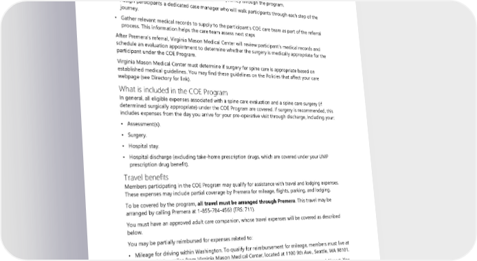 You may receive information in the mail about the COE Program, which will explain how the program works and whom to contact for more information. Premera will screen applicants to initially determine whether they are eligible to participate in the COE Program. What happens after you are approved to participate After you are approved to participate in the program, Premera will: • Provide a booklet to participants describing their journey through the program. • Assign participants a dedicated case manager who will walk participants through each step of the journey. • Gather relevant medical records to supply to the participant’s COE care team as part of the referral process. This information helps the care team assess next steps After Premera’s referral, Virginia Mason Medical Center will review participant’s medical records and schedule an evaluation appointment to determine whether the surgery is medically appropriate for the participant under the COE Program. Virginia Mason Medical Center must determine if surgery for spine care is appropriate based on established medical guidelines. You may find these guidelines on the Policies that affect your care webpage (see Directory for link). What is included in the COE Program In general, all eligible expenses associated with a spine care evaluation and a spine care surgery (if determined surgically appropriate) under the COE Program are covered. If surgery is recommended, this includes expenses from the day you arrive for your pre-operative visit through discharge, including your: • Assessment(s). • Surgery. • Hospital stay. • Hospital discharge (excluding take-home prescription drugs, which are covered under your UMP prescription drug benefit). Travel benefits Members participating in the COE Program may qualify for assistance with travel and lodging expenses. These expenses may include partial coverage by Premera for mileage, flights, parking, and lodging. To be covered by the program, all travel must be arranged through Premera. This travel may be arranged by calling Premera at 1-855-784-4563 (TRS: 711). You must have an approved adult care companion, whose travel expenses will be covered as described below. You may be partially reimbursed for expenses related to: • Mileage for driving within Washington. To qualify for reimbursement for mileage, members must live at least 60 driving miles from Virginia Mason Medical Center, located at 1100 9th Ave., Seattle, WA 98101. • Flights departing from and arriving at airports within Washington or Portland International Airport. You must depart from the airport closest to your residence. • Ground transportation from Seattle-Tacoma International Airport to Virginia Mason Medical Center. • Lodging expenses (excluding meals) at a COE-designated hotel. Premera must arrange all lodging. • Parking at Virginia Mason Medical Center and parking at your departing airport. 70 2024 UMP Select (PEBB) Certificate of Coverage