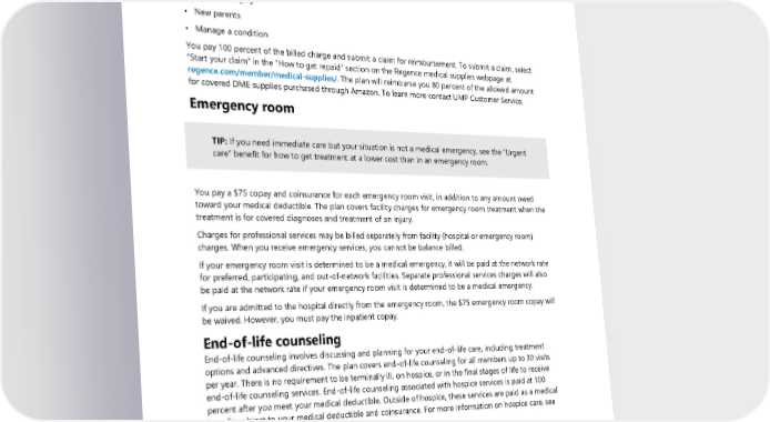 Commercial DME You may purchase DME on Amazon by signing in to your Regence account and going to the Regence medical supplies webpage at regence.com/member/medical-supplies/. Select “Get started” in the Shop smart and save section. This will take you to the Amazon page where you will select and shop from one of the four categories for DME supplies: • Post-mastectomy • Illness and injury • New parents • Manage a condition You pay 100 percent of the billed charge and submit a claim for reimbursement. To submit a claim, select “Start your claim” in the “How to get repaid” section on the Regence medical supplies webpage at regence.com/member/medical-supplies/. The plan will reimburse you 80 percent of the allowed amount for covered DME supplies purchased through Amazon. To learn more contact UMP Customer Service. Emergency room TIP: If you need immediate care but your situation is not a medical emergency, see the “Urgent care” benefit for how to get treatment at a lower cost than in an emergency room. You pay a $75 copay and coinsurance for each emergency room visit, in addition to any amount owed toward your medical deductible. The plan covers facility charges for emergency room treatment when the treatment is for covered diagnoses and treatment of an injury. Charges for professional services may be billed separately from facility (hospital or emergency room) charges. When you receive emergency services, you cannot be balance billed. If your emergency room visit is determined to be a medical emergency, it will be paid at the network rate for preferred, participating, and out-of-network facilities. Separate professional services charges will also be paid at the network rate if your emergency room visit is determined to be a medical emergency. If you are admitted to the hospital directly from the emergency room, the $75 emergency room copay will be waived. However, you must pay the inpatient copay. End-of-life counseling End-of-life counseling involves discussing and planning for your end-of-life care, including treatment options and advanced directives. The plan covers end-of-life counseling for all members up to 30 visits per year. There is no requirement to be terminally ill, on hospice, or in the final stages of life to receive end-of-life counseling services. End-of-life counseling associated with hospice services is paid at 100 percent after you meet your medical deductible. Outside of hospice, these services are paid as a medical benefit, subject to your medical deductible and coinsurance. For more information on hospice care, see page 53. Family planning services If you receive care from a network provider, the plan will pay for the following covered services at the preventive rate: • Contraceptive drugs and devices including condoms and spermicides • Voluntary and involuntary termination of pregnancy (abortion or miscarriage) 2024 UMP Select (PEBB) Certificate of Coverage 49