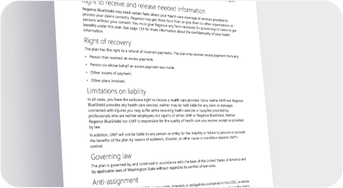 Relationship to Blue Cross and Blue Shield Association HCA, on behalf of itself and its members, hereby expressly acknowledges that this contract constitutes an agreement solely between HCA and Regence BlueShield, an independent corporation operating under a license from the Blue Cross and Blue Shield Association, an association of independent Blue Cross and Blue Shield plans (the “Association”), permitting the contractor Regence BlueShield to use the Washington license for those counties designated in its service area. Right to receive and release needed information Regence BlueShield may need certain facts about your health care coverage or services provided to process your claims correctly. Regence may get these facts from or give them to other organizations or persons without your consent. You must give Regence any facts necessary for processing of claims to get benefits under this plan. See page 139 for more information about the confidentiality of your health information. Right of recovery The plan has the right to a refund of incorrect payments. The plan may recover excess payment from any: • Person that received an excess payment. • Person on whose behalf an excess payment was made. • Other issuers of payment. • Other plans involved. Limitations on liability In all cases, you have the exclusive right to choose a health care provider. Since neither UMP nor Regence BlueShield provides any health care services, neither may be held liable for any claim or damages connected with injuries you may suffer while receiving health services or supplies provided by professionals who are neither employees nor agents of either UMP or Regence BlueShield. Neither Regence BlueShield nor UMP is responsible for the quality of health care you receive, except as provided by law. In addition, UMP will not be liable to any person or entity for the inability or failure to procure or provide the benefits of the plan by reason of epidemic, disaster, or other cause or condition beyond UMP’s control. Governing law The plan is governed by and construed in accordance with the laws of the United States of America and by applicable laws of Washington State without regard to its conflict of law rules. Anti-assignment Members may not assign this COC, or any rights, interests or obligations contained in this COC, in whole or in part, to a third party (including, but not limited to, providers of medical services), without the plan’s written consent. Any attempt to assign any rights, interests or obligations contained in this COC, in whole or in part, to a third party is void and/or invalid, and the plan will not recognize it. No waiver The failure or refusal of either party to demand strict performance of the plan or to enforce any provision will not act as or be construed as a waiver of that party’s right to later demand its performance or to 140 2024 UMP Select (PEBB) Certificate of Coverage