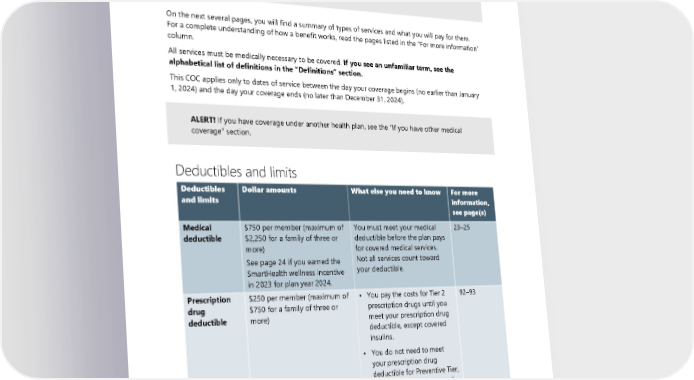 Summary of services and payments ALERT! Even if a provider orders a test or prescribes a treatment, the plan may not cover it. Review this COC or contact UMP Customer Service if you have questions about benefits or limitations. On the next several pages, you will find a summary of types of services and what you will pay for them. For a complete understanding of how a benefit works, read the pages listed in the “For more information” column. All services must be medically necessary to be covered. If you see an unfamiliar term, see the alphabetical list of definitions in the “Definitions” section. This COC applies only to dates of service between the day your coverage begins (no earlier than January 1, 2024) and the day your coverage ends (no later than December 31, 2024). ALERT! If you have coverage under another health plan, see the “If you have other medical coverage” section. Deductibles and limits Deductibles Dollar amounts What else you need to know For more and limits information, see page(s) Medical $750 per member (maximum of You must meet your medical 23–25 deductible $2,250 for a family of three or deductible before the plan pays more) for covered medical services. See page 24 if you earned the Not all services count toward SmartHealth wellness incentive your deductible. in 2023 for plan year 2024. Prescription $250 per member (maximum of • You pay the costs for Tier 2 92–93 drug $750 for a family of three or prescription drugs until you deductible more) meet your prescription drug deductible, except covered insulins. • You do not need to meet your prescription drug deductible for Preventive Tier, Value Tier, Tier 1 drugs, and covered insulins. 28 2024 UMP Select (PEBB) Certificate of Coverage