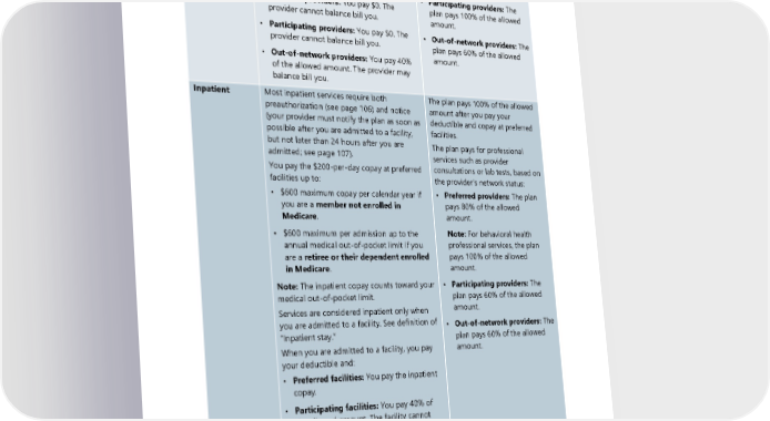 Type of How much you pay for covered services How much the plan pays for service covered services Preventive Covered preventive services are not subject to • Preferred providers: The plan your medical deductible. How much you pay pays 100% of the allowed (your coinsurance) depends on the provider’s amount. network status: • Participating providers: The • Preferred providers: You pay $0. The plan pays 100% of the allowed provider cannot balance bill you. amount. • Participating providers: You pay $0. The • Out-of-network providers: The provider cannot balance bill you. plan pays 60% of the allowed • Out-of-network providers: You pay 40% amount. of the allowed amount. The provider may balance bill you. Inpatient Most inpatient services require both The plan pays 100% of the allowed preauthorization (see page 106) and notice amount after you pay your (your provider must notify the plan as soon as deductible and copay at preferred possible after you are admitted to a facility, facilities. but not later than 24 hours after you are The plan pays for professional admitted; see page 107). services such as provider You pay the $200-per-day copay at preferred consultations or lab tests, based on facilities up to: the provider’s network status: • $600 maximum copay per calendar year if • Preferred providers: The plan you are a member not enrolled in pays 80% of the allowed Medicare. amount. • $600 maximum per admission up to the Note: For behavioral health annual medical out-of-pocket limit if you professional services, the plan are a retiree or their dependent enrolled pays 100% of the allowed in Medicare. amount. Note: The inpatient copay counts toward your • Participating providers: The medical out-of-pocket limit. plan pays 60% of the allowed Services are considered inpatient only when amount. you are admitted to a facility. See definition of • Out-of-network providers: The “Inpatient stay.” plan pays 60% of the allowed When you are admitted to a facility, you pay amount. your deductible and: • Preferred facilities: You pay the inpatient copay. • Participating facilities: You pay 40% of the allowed amount. The facility cannot balance bill you. • Out-of-network facilities: You pay 40% of the allowed amount. The facility may balance bill you. 30 2024 UMP Select (PEBB) Certificate of Coverage