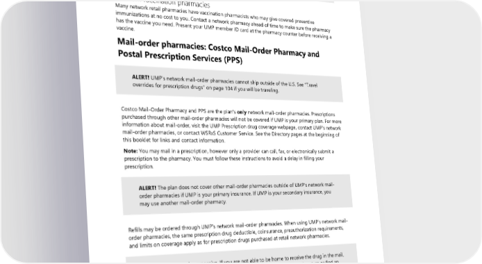 TIP: If you take a prescription drug regularly, you may be able to save money by filling up to a 90-day supply at a network retail pharmacy or through UMP’s network mail-order pharmacies. Search for a network pharmacy and compare prices on the UMP Prescription drug coverage webpage. Network vaccination pharmacies Many network retail pharmacies have vaccination pharmacists who may give covered preventive immunizations at no cost to you. Contact a network pharmacy ahead of time to make sure the pharmacy has the vaccine you need. Present your UMP member ID card at the pharmacy counter before receiving a vaccine. Mail-order pharmacies: Costco Mail-Order Pharmacy and Postal Prescription Services (PPS) ALERT! UMP’s network mail-order pharmacies cannot ship outside of the U.S. See “Travel overrides for prescription drugs” on page 104 if you will be traveling. Costco Mail-Order Pharmacy and PPS are the plan’s only network mail-order pharmacies. Prescriptions purchased through other mail-order pharmacies will not be covered if UMP is your primary plan. For more information about mail-order, visit the UMP Prescription drug coverage webpage, contact UMP’s network mail-order pharmacies, or contact WSRxS Customer Service. See the Directory pages at the beginning of this booklet for links and contact information. Note: You may mail in a prescription, however only a provider can call, fax, or electronically submit a prescription to the pharmacy. You must follow these instructions to avoid a delay in filling your prescription. ALERT! The plan does not cover other mail-order pharmacies outside of UMP’s network mail- order pharmacies if UMP is your primary insurance. If UMP is your secondary insurance, you may use another mail-order pharmacy. Refills may be ordered through UMP’s network mail-order pharmacies. When using UMP’s network mail- order pharmacies, the same prescription drug deductible, coinsurance, preauthorization requirements, and limits on coverage apply as for prescription drugs purchased at retail network pharmacies. ALERT! Drugs can be expensive. If you are not able to be home to receive the drug in the mail, it may be a good idea to request that it be sent with a requirement for a signature or find an alternate point of delivery to ensure the package is not stolen. The plan is not responsible for replacement of lost, stolen, expired, or damaged prescription drugs or products (see the “What the plan does not cover” section). 2024 UMP Select (PEBB) Certificate of Coverage 97