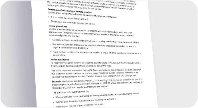 Note: UMP is not affiliated with the Uniform Dental Plan (UDP). If you are enrolled in UDP, contact UDP for information about services covered under your dental plan. Visit the HCA website at hca.wa.gov/erb and select “Contact” to find UDP contact information. Fluoride treatment Under certain circumstances, the plan may cover fluoride supplements (see the “Preventive care” benefit) at the preventive rate. The application of fluoride varnish may be covered for infants and children starting at the age when primary teeth come in (primary teeth eruption) in primary care practices for prevention of tooth decay (dental caries or cavities). Coverage of fluoride treatment depends on the network status of the medical provider as described in the “Finding a health care provider” section. Health care providers, such as your child’s medical PCP, may apply fluoride varnish. General anesthesia during a dental procedure General anesthesia performed during a dental procedure is covered only when: • It is provided by an anesthesiologist; and • The charges are covered by the plan (see below). Dental procedures General anesthesia may be performed in a dental office for covered procedures and is paid at the standard rate. Dental procedures that are performed in a hospital or ambulatory surgery center are covered only when the member: • Is under age 8 with a dental condition that cannot be safely and effectively treated in a dental office; or • Has a dental condition that cannot be safely and effectively treated in a dental office because of a physical or developmental disability; or • Has a medical condition that would put the member at undue risk if the procedure were performed in a dental office. Accidental injuries To receive coverage for repair of an accidental injury to natural teeth, the injury must be evaluated, and a treatment plan developed and finalized within 30 days of the injury. The actual treatment may extend beyond 30 days if your provider determines upon the initial assessment that treatment should start later or continue longer. Treatment must be completed by the end of the calendar year following the accident. The plan does not cover treatment after UMP coverage ends. Example: You have an accident on March 12, 2024, resulting in injuries that are covered by the plan. Your treatment plan must be finalized no later than April 11, 2024. All related treatment must be completed by December 31, 2025 (the calendar year following the accident). The plan does not cover treatment that: • Was not included in the treatment plan developed within the first 30 days following the accident; • Extends past the end of the calendar year following the accident; or • Extends past the end of your enrollment in the plan. Diabetes care supplies TIP: If a health plan other than UMP is your primary payer, claims for diabetes care supplies may be paid differently (see page 123). 44 2024 UMP Select (PEBB) Certificate of Coverage