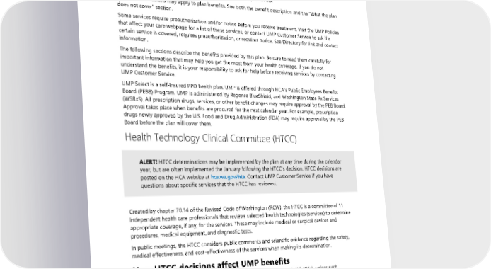 • Be received by a member on a day between the date coverage begins (but no sooner than January 1, 2024) and the date coverage ends (but no later than December 31, 2024); and • Have been determined to be a covered benefit by the Health Technology Clinical Committee (HTCC), if reviewed by the HTCC, and, if determined to be covered with conditions, meet the conditions of coverage established by the HTCC; and • Meet the plan’s coverage policies and preauthorization requirements. Limits and exclusions may apply to plan benefits. See both the benefit description and the “What the plan does not cover” section. Some services require preauthorization and/or notice before you receive treatment. Visit the UMP Policies that affect your care webpage for a list of these services, or contact UMP Customer Service to ask if a certain service is covered, requires preauthorization, or requires notice. See Directory for link and contact information. The following sections describe the benefits provided by this plan. Be sure to read them carefully for important information that may help you get the most from your health coverage. If you do not understand the benefits, it is your responsibility to ask for help before receiving services by contacting UMP Customer Service. UMP Select is a self-insured PPO health plan. UMP is offered through HCA’s Public Employees Benefits Board (PEBB) Program. UMP is administered by Regence BlueShield, and Washington State Rx Services (WSRxS). All prescription drugs, services, or other benefit changes may require approval by the PEB Board. Approval takes place when benefits are procured for the next calendar year. For example, prescription drugs newly approved by the U.S. Food and Drug Administration (FDA) may require approval by the PEB Board before the plan will cover them. Health Technology Clinical Committee (HTCC) ALERT! HTCC determinations may be implemented by the plan at any time during the calendar year, but are often implemented the January following the HTCC’s decision. HTCC decisions are posted on the HCA website at hca.wa.gov/hta. Contact UMP Customer Service if you have questions about specific services that the HTCC has reviewed. Created by chapter 70.14 of the Revised Code of Washington (RCW), the HTCC is a committee of 11 independent health care professionals that reviews selected health technologies (services) to determine appropriate coverage, if any, for the services. These may include medical or surgical devices and procedures, medical equipment, and diagnostic tests. In public meetings, the HTCC considers public comments and scientific evidence regarding the safety, medical effectiveness, and cost-effectiveness of the services when making its determination. How HTCC decisions affect UMP benefits Under state law, the plan must comply with HTCC decisions, RCW 70.14.120 (1)(a), unless such determination conflicts with federal or state law. Services reviewed by the HTCC are either covered, covered with conditions, or not covered. The HTCC determines the conditions, if any, under which the service will be included as a covered benefit and, if covered, the criteria the plan must use to decide whether the service is medically necessary. Criteria established by the HTCC take precedence over Regence’s medical policies. When the HTCC determines that a service is not covered, then the service is not covered by the plan. Some HTCC decisions include a requirement to follow FDA or Centers for 2024 UMP Select (PEBB) Certificate of Coverage 33