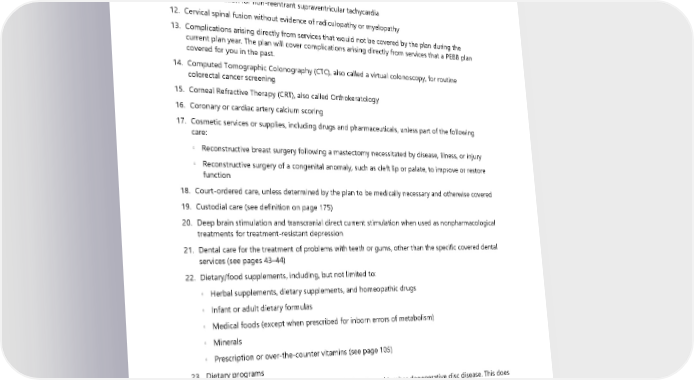 ◦ Ultrasonic stimulator – delayed fractures and concurrent use with another noninvasive stimulator. 7. Bone morphogenetic protein-7 (rhBMP-7) for use in lumbar fusion 8. Bronchial thermoplasty for asthma 9. Carotid artery stenting of intracranial arteries 10. Carotid intima media thickness testing 11. Catheter ablation for non-reentrant supraventricular tachycardia 12. Cervical spinal fusion without evidence of radiculopathy or myelopathy 13. Complications arising directly from services that would not be covered by the plan during the current plan year. The plan will cover complications arising directly from services that a PEBB plan covered for you in the past. 14. Computed Tomographic Colonography (CTC), also called a virtual colonoscopy, for routine colorectal cancer screening 15. Corneal Refractive Therapy (CRT), also called Orthokeratology 16. Coronary or cardiac artery calcium scoring 17. Cosmetic services or supplies, including drugs and pharmaceuticals, unless part of the following care: ◦ Reconstructive breast surgery following a mastectomy necessitated by disease, illness, or injury ◦ Reconstructive surgery of a congenital anomaly, such as cleft lip or palate, to improve or restore function 18. Court-ordered care, unless determined by the plan to be medically necessary and otherwise covered 19. Custodial care (see definition on page 175) 20. Deep brain stimulation and transcranial direct current stimulation when used as nonpharmacological treatments for treatment-resistant depression 21. Dental care for the treatment of problems with teeth or gums, other than the specific covered dental services (see pages 43–44) 22. Dietary/food supplements, including, but not limited to: ◦ Herbal supplements, dietary supplements, and homeopathic drugs ◦ Infant or adult dietary formulas ◦ Medical foods (except when prescribed for inborn errors of metabolism) ◦ Minerals ◦ Prescription or over-the-counter vitamins (see page 105) 23. Dietary programs 24. Discography for patients with chronic low back pain and lumbar degenerative disc disease. This does not apply to patients with the following conditions: ◦ Degenerative disease associated with significant deformity ◦ Fracture, tumor, infection, and inflammatory disease ◦ Functional neurologic deficits (motor weakness or Electromyography [EMG] findings of radiculopathy) 110 2024 UMP Select (PEBB) Certificate of Coverage
