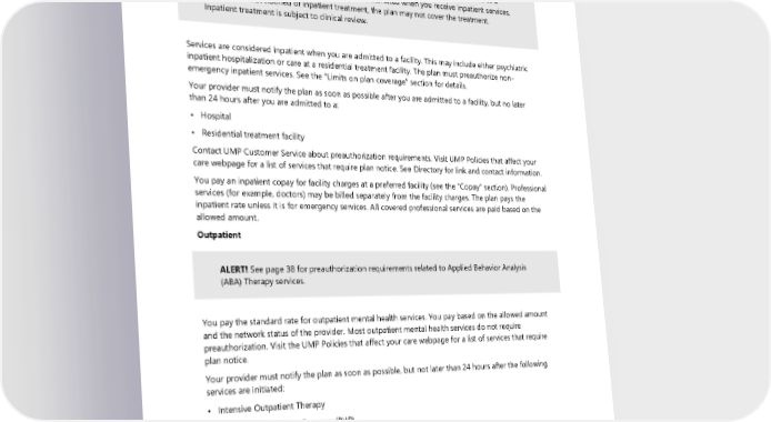 network status (see the “Finding a health care provider” section and page 30). See below for details about coverage for substance use disorder treatment. Inpatient ALERT! Your provider must notify the plan as soon as possible after you are admitted to a facility, but not later than 24 hours after you are admitted when you receive inpatient services. If the plan is not notified of inpatient treatment, the plan may not cover the treatment. Inpatient treatment is subject to clinical review. Services are considered inpatient when you are admitted to a facility. This may include either psychiatric inpatient hospitalization or care at a residential treatment facility. The plan must preauthorize non- emergency inpatient services. See the “Limits on plan coverage” section for details. Your provider must notify the plan as soon as possible after you are admitted to a facility, but no later than 24 hours after you are admitted to a: • Hospital • Residential treatment facility Contact UMP Customer Service about preauthorization requirements. Visit UMP Policies that affect your care webpage for a list of services that require plan notice. See Directory for link and contact information. You pay an inpatient copay for facility charges at a preferred facility (see the “Copay” section). Professional services (for example, doctors) may be billed separately from the facility charges. The plan pays the inpatient rate unless it is for emergency services. All covered professional services are paid based on the allowed amount. Outpatient ALERT! See page 38 for preauthorization requirements related to Applied Behavior Analysis (ABA) Therapy services. You pay the standard rate for outpatient mental health services. You pay based on the allowed amount and the network status of the provider. Most outpatient mental health services do not require preauthorization. Visit the UMP Policies that affect your care webpage for a list of services that require plan notice. Your provider must notify the plan as soon as possible, but not later than 24 hours after the following services are initiated: • Intensive Outpatient Therapy • Partial Hospitalization Program (PHP) Substance use disorder Substance use disorder is defined as an illness characterized by a physiological or psychological dependency on a controlled substance or alcohol. Substance use disorder does not include dependence on tobacco, caffeine, or food. To be covered, treatment programs must be licensed to provide treatment to persons requiring substance use disorder treatment. The amount the plan pays depends on the provider’s network status (see the 40 2024 UMP Select (PEBB) Certificate of Coverage
