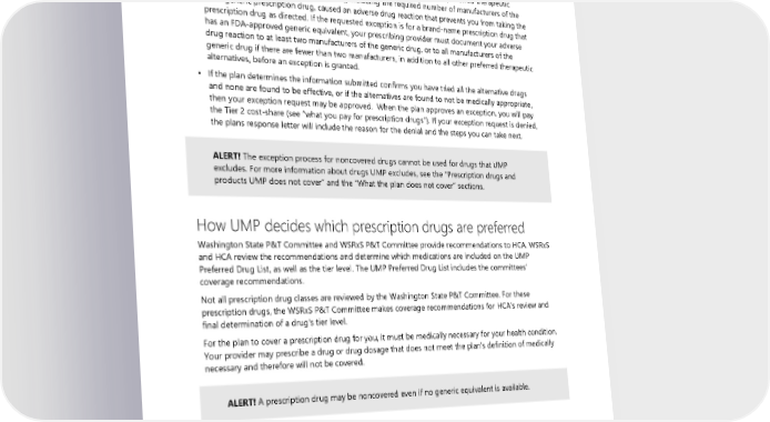 and failed to produce a therapeutic response. If the requested exception is for a brand-name prescription drug that has an FDA-approved generic equivalent, your prescribing provider must document your inadequate response to at least two manufacturers of the generic drug, or to all manufacturers of the generic drug if there are fewer than two manufacturers, in addition to all other preferred therapeutic alternatives before an exception is granted; or ▪ Confirmation and documentation from your prescribing provider that all preferred therapeutic alternatives (Value Tier, Tier 1, and Tier 2), including the required number of manufacturers of the same generic prescription drug, caused an adverse drug reaction that prevents you from taking the prescription drug as directed. If the requested exception is for a brand-name prescription drug that has an FDA-approved generic equivalent, your prescribing provider must document your adverse drug reaction to at least two manufacturers of the generic drug, or to all manufacturers of the generic drug if there are fewer than two manufacturers, in addition to all other preferred therapeutic alternatives, before an exception is granted. ▪ If the plan determines the information submitted confirms you have tried all the alternative drugs and none are found to be effective, or if the alternatives are found to not be medically appropriate, then your exception request may be approved. When the plan approves an exception, you will pay the Tier 2 cost-share (see “what you pay for prescription drugs”). If your exception request is denied, the plans response letter will include the reason for the denial and the steps you can take next. ALERT! The exception process for noncovered drugs cannot be used for drugs that UMP excludes. For more information about drugs UMP excludes, see the “Prescription drugs and products UMP does not cover” and the “What the plan does not cover” sections. How UMP decides which prescription drugs are preferred Washington State P&T Committee and WSRxS P&T Committee provide recommendations to HCA. WSRxS and HCA review the recommendations and determine which medications are included on the UMP Preferred Drug List, as well as the tier level. The UMP Preferred Drug List includes the committees’ coverage recommendations. Not all prescription drug classes are reviewed by the Washington State P&T Committee. For these prescription drugs, the WSRxS P&T Committee makes coverage recommendations for HCA’s review and final determination of a drug’s tier level. For the plan to cover a prescription drug for you, it must be medically necessary for your health condition. Your provider may prescribe a drug or drug dosage that does not meet the plan’s definition of medically necessary and therefore will not be covered. ALERT! A prescription drug may be noncovered even if no generic equivalent is available. Guidelines for prescription drugs UMP covers To be covered, a prescription drug must meet all of the following: • Is listed on the UMP Preferred Drug List (The Preferred Drug List is subject to change). • Does not have a nonprescription alternative, including an over-the-counter alternative with similar safety, effectiveness, and ingredients. 88 2024 UMP Select (PEBB) Certificate of Coverage