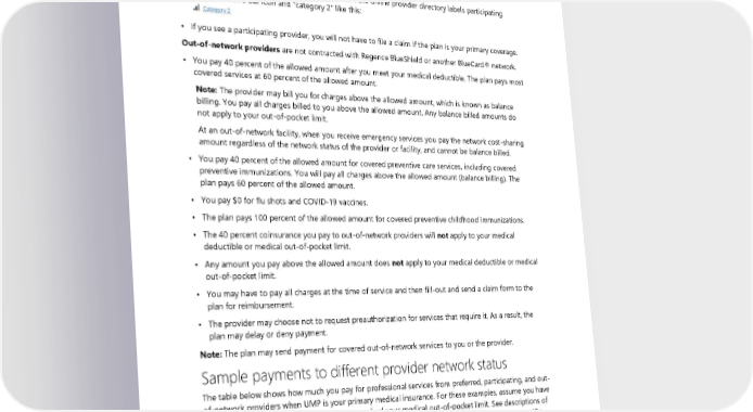 • You pay 40 percent of the allowed amount after you meet your medical deductible. The plan pays most covered services at 60 percent of the allowed amount. • You pay $0 for covered preventive care services, including covered immunizations. The plan pays 100 percent of the allowed amount. • The provider cannot bill you for charges above the allowed amount. • When you are signed in to your Regence account the online provider directory labels participating providers with a bar icon and “category 2” like this: • If you see a participating provider, you will not have to file a claim if the plan is your primary coverage. Out-of-network providers are not contracted with Regence BlueShield or another BlueCard® network. • You pay 40 percent of the allowed amount after you meet your medical deductible. The plan pays most covered services at 60 percent of the allowed amount. Note: The provider may bill you for charges above the allowed amount, which is known as balance billing. You pay all charges billed to you above the allowed amount. Any balance billed amounts do not apply to your out-of-pocket limit. At an out-of-network facility, when you receive emergency services you pay the network cost-sharing amount regardless of the network status of the provider or facility, and cannot be balance billed. • You pay 40 percent of the allowed amount for covered preventive care services, including covered preventive immunizations. You will pay all charges above the allowed amount (balance billing). The plan pays 60 percent of the allowed amount. • You pay $0 for flu shots and COVID-19 vaccines. • The plan pays 100 percent of the allowed amount for covered preventive childhood immunizations. • The 40 percent coinsurance you pay to out-of-network providers will not apply to your medical deductible or medical out-of-pocket limit. • Any amount you pay above the allowed amount does not apply to your medical deductible or medical out-of-pocket limit. • You may have to pay all charges at the time of service and then fill-out and send a claim form to the plan for reimbursement. • The provider may choose not to request preauthorization for services that require it. As a result, the plan may delay or deny payment. Note: The plan may send payment for covered out-of-network services to you or the provider. Sample payments to different provider network status The table below shows how much you pay for professional services from preferred, participating, and out- of-network providers when UMP is your primary medical insurance. For these examples, assume you have met your medical deductible and have not reached your medical out-of-pocket limit. See descriptions of these provider types beginning on page 14. These are examples only and may not reflect your specific situation. 16 2024 UMP Select (PEBB) Certificate of Coverage