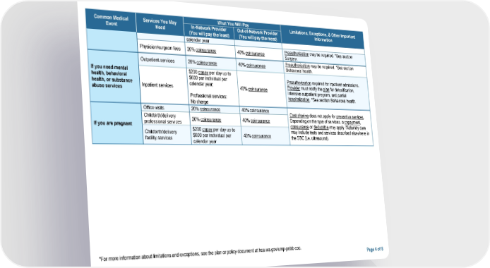 Common Medical Services You May What You Will Pay Limitations, Exceptions, & Other Important Event Need In-Network Provider Out-of-Network Provider Information (You will pay the least) (You will pay the most) calendar year Physician/surgeon fees 20% coinsurance 40% coinsurance Preauthorization may be required. *See section Surgery. Outpatient services 20% coinsurance 40% coinsurance Preauthorization may be required. *See section Behavioral health. If you need mental $200 copay per day up to health, behavioral $600 per individual per Preauthorization required for inpatient admissions. health, or substance Inpatient services calendar year; 40% coinsurance Provider must notify the plan for detoxification, abuse services intensive outpatient program, and partial Professional services: hospitalization. *See section Behavioral health. No charge Office visits 20% coinsurance 40% coinsurance Cost sharing does not apply for preventive services. Childbirth/delivery 20% coinsurance 40% coinsurance Depending on the type of services, a copayment, If you are pregnant professional services coinsurance or deductible may apply. Maternity care Childbirth/delivery $200 copay per day up to may include tests and services described elsewhere in facility services $600 per individual per 40% coinsurance the SBC (i.e. ultrasound). calendar year *For more information about limitations and exceptions, see the plan or policy document at hca.wa.gov/ump-pebb-coc. Page 4 of 8