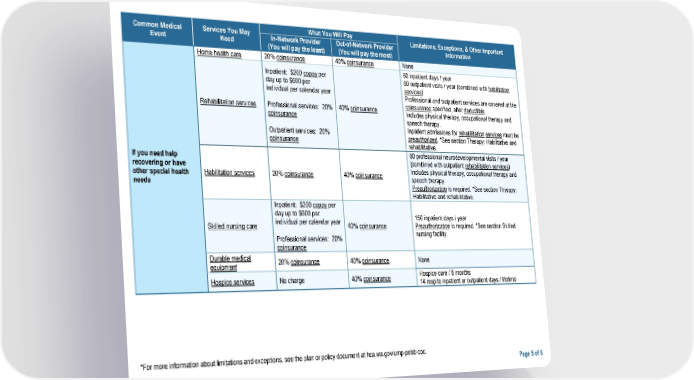 Common Medical Services You May What You Will Pay Limitations, Exceptions, & Other Important Event Need In-Network Provider Out-of-Network Provider Information (You will pay the least) (You will pay the most) Home health care 20% coinsurance 40% coinsurance None Inpatient: $200 copay per 60 inpatient days / year day up to $600 per 60 outpatient visits / year (combined with habilitation individual per calendar year services) Professional and outpatient services are covered at the Rehabilitation services Professional services: 20% 40% coinsurance coinsurance specified, after deductible. coinsurance Includes physical therapy, occupational therapy and speech therapy. Outpatient services: 20% Inpatient admissions for rehabilitation services must be coinsurance preauthorized. *See section Therapy: Habilitative and rehabilitative. If you need help 60 professional neurodevelopmental visits / year recovering or have (combined with outpatient rehabilitation services) other special health Habilitation services 20% coinsurance 40% coinsurance Includes physical therapy, occupational therapy and needs speech therapy. Preauthorization is required. *See section Therapy: Habilitative and rehabilitative. Inpatient: $200 copay per day up to $600 per 150 inpatient days / year Skilled nursing care individual per calendar year 40% coinsurance Preauthorization is required. *See section Skilled Professional services: 20% nursing facility. coinsurance Durable medical 20% coinsurance 40% coinsurance None equipment Hospice services No charge 40% coinsurance Hospice care / 6 months 14 respite inpatient or outpatient days / lifetime *For more information about limitations and exceptions, see the plan or policy document at hca.wa.gov/ump-pebb-coc. Page 5 of 8